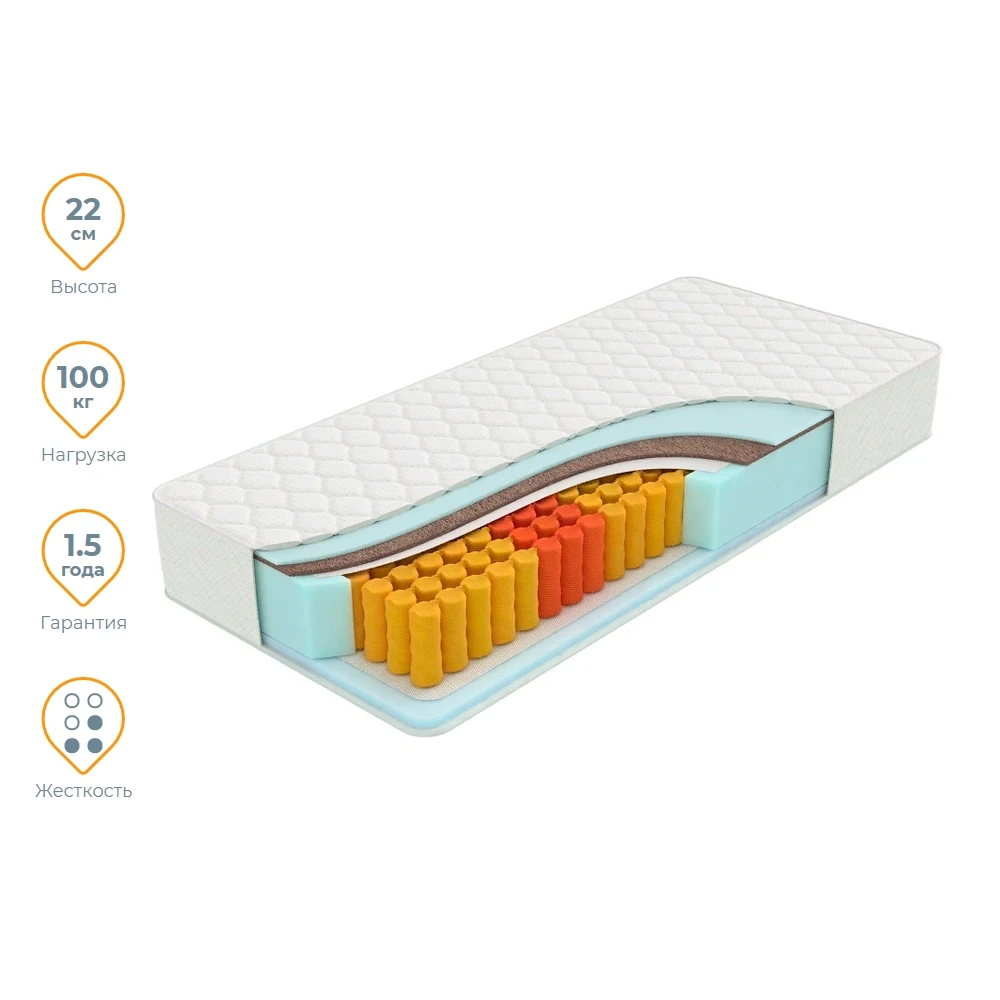 Пружины в сжатом состоянии чутко реагируют на изменение нагрузки, увеличивая анатомический эффект матраса и снижая обратное давление на тело человека. Кокосовая койра с одной стороны придает модели жесткость, ormafoam с другой — комфорт и мягкость.