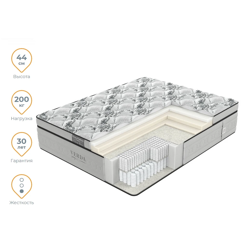 Verda Hi-Cloud — уникальный матрас класса «премиум». В отличие от обычных моделей в его основе лежит сразу два блока независимых пружин — система High End. Вместе они обеспечивает максимально хорошую поддержку позвоночника и позволяют создать поистине роскошную модель матраса. Помимо пружинных блоков в состав модели входит два слоя современных пенных материалов: Senso Touch и Selective Foam.