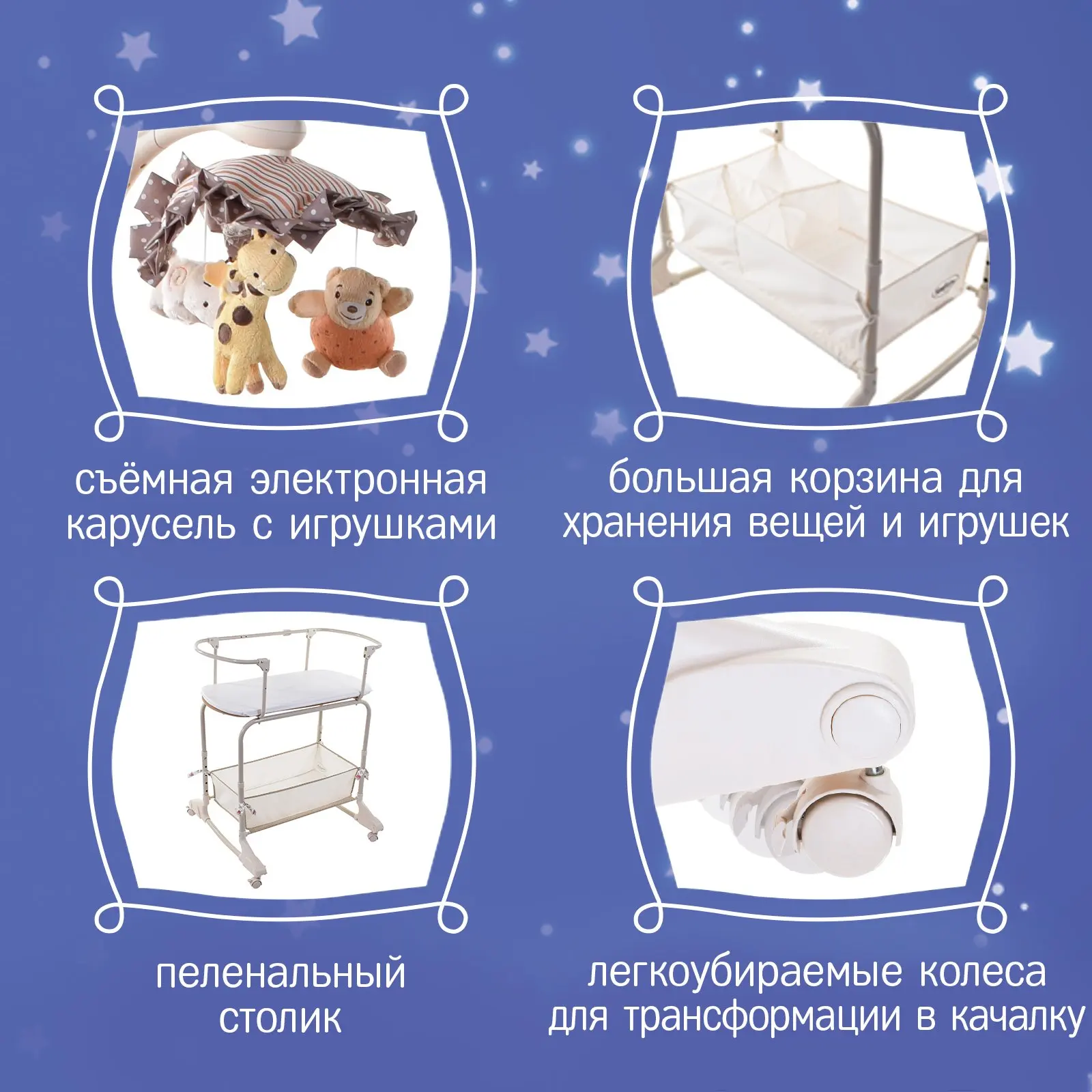 • Вибрационная система укачивания успокоит малыша, помогая ему заснуть.