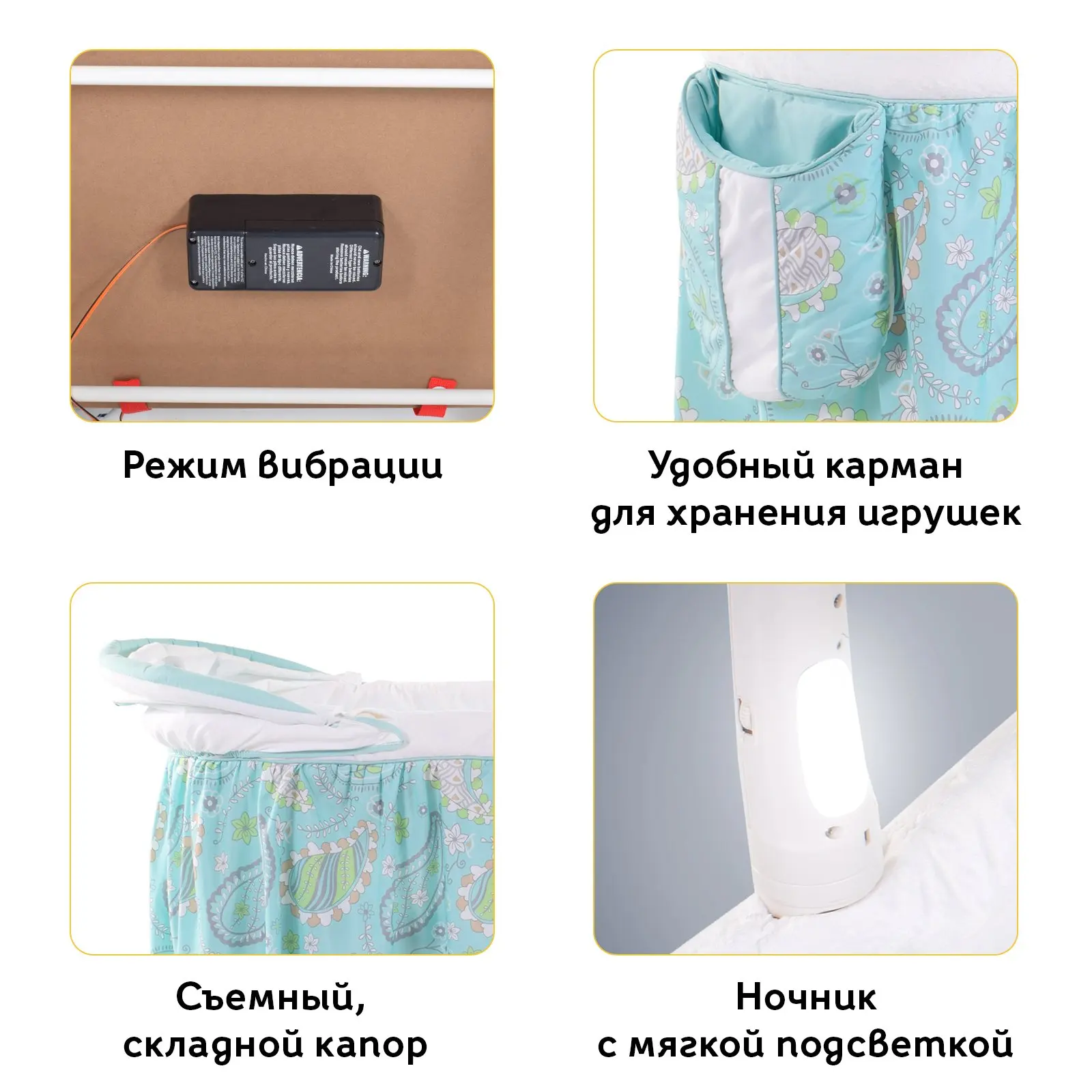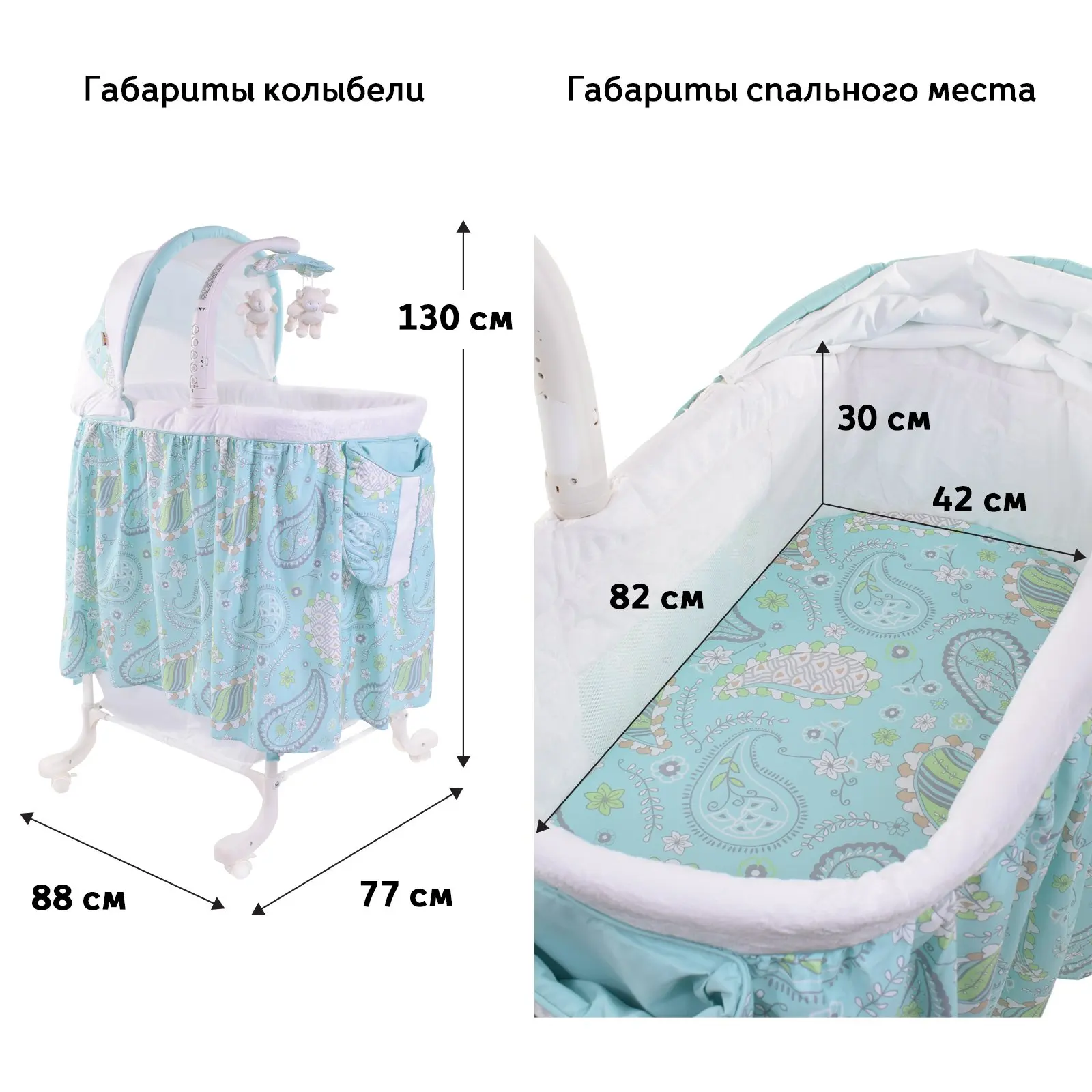 Уровень ложа устанавливается в 3-х положениях, подстраивая высоту под рост мамы. Карман, на покрытых тканью бортиках, служит местом хранения для игрушек и прочих небольших вещей. Капор защищает от яркого солнышка и сквозняка. В нижней части колыбели расположена сетчатая корзина для белья. Колесики позволяют бесшумно перемещать колыбель, а при необходимости их можно зафиксировать стопорами.