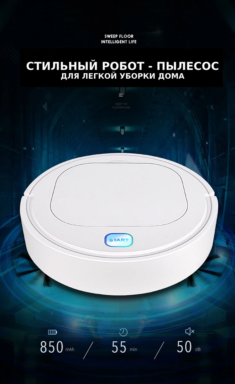 Название продукта: Smart Robot vacuum cleaner / Автоматический робот - пылесос Упаковка товара: Цветная коробка Размер продукта: 28*28*6,8 см Размер упаковки: 30*30*8 см Вес робота пылесоса: 800 г Время работы: до 55 минут Время зарядки: до 4 часов Контейнер для пыли: около 200 мл Метод зарядки: зарядка через USB Номинальная мощность робота - пылесоса: 95 Вт Батарея: 850 мАч (входит в комплект) Одноразовая площадь уборки: 150 ㎡ Рабочая поверхность для робота - пылесоса: плоский пол, мрамор, плитка, деревянный пол