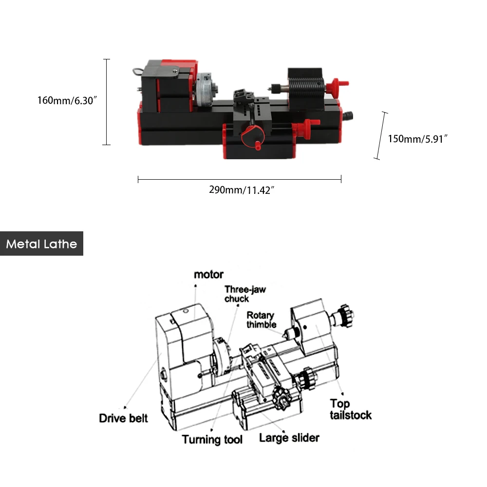 Размер металлического токарного станка: 29*15*16 см/11,42*5,91*6,30 дюймов