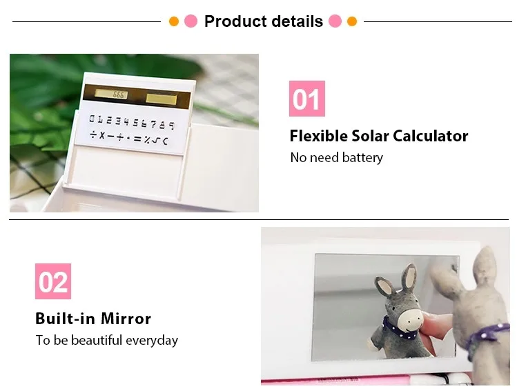 Откройте с обеих сторон, с калькулятором и зеркалом, калькулятор обновлен до съемного, солнечный калькулятор, используя естественный светильник, чтобы генерировать электричество, батарея не требуется.