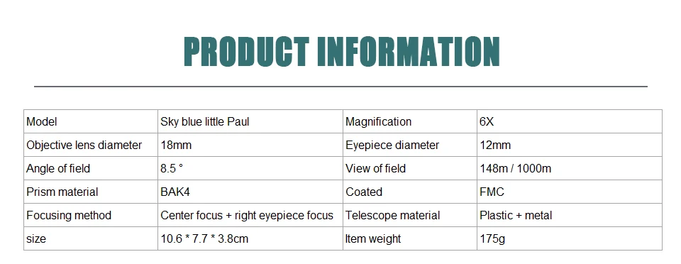 1. Компактный бинокль с 6x увеличением и объективом 18 мм. 2. Призма BAK4 и многослойные линзы обеспечивают улучшенную передачу и четкость изображения на светильник. 3. Эргономичная резиновая броня поглощает удары, обеспечивая безопасное сцепление. 4. Центральная Ручка фокусировки для плавной работы. Поле зрения: 148 м/1000 м. 5. Регулировка диоптрий для точной настройки. 6. Легкий и компактный, хорошо подходит для кемпинга, пеших прогулок, концертов, наблюдения за птицами, охоты, путешествий, игры в гольф, спортивных мероприятий и других видов активного отдыха. 7. Поставляется с сумкой для переноски, салфеткой для чистки, шейным ремешком и руководством пользователя. 8. Милая форма, отличный рождественский подарок для детей. Технические характеристики: Название: мини-лупа Увеличение: 6X Диаметр окуляра: 12 мм Диаметр объектива: 18 мм Поле зрения: 8,5 Поле зрения: 148 м/1000 м Призма материал: BAK4 Покрытие: FMC Метод фокусировки: Центральная Ручка фокусировки + правый глаз фокусировки Материал корпуса: пластик + металл Размер: 106*71*38 мм Вес: 175 г