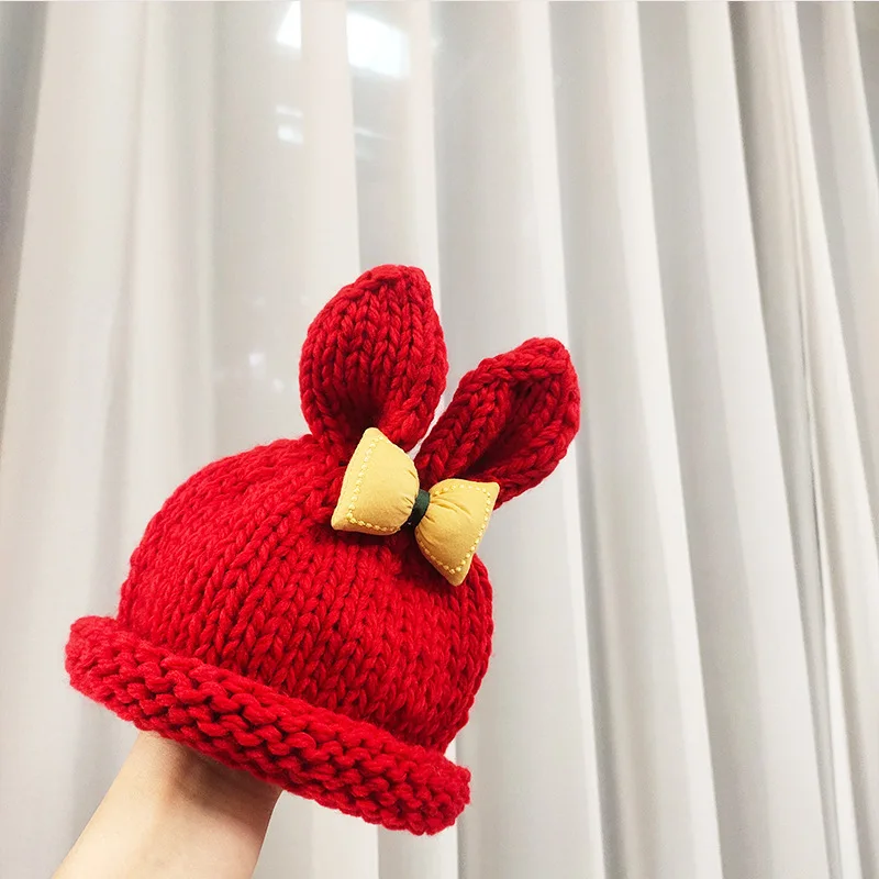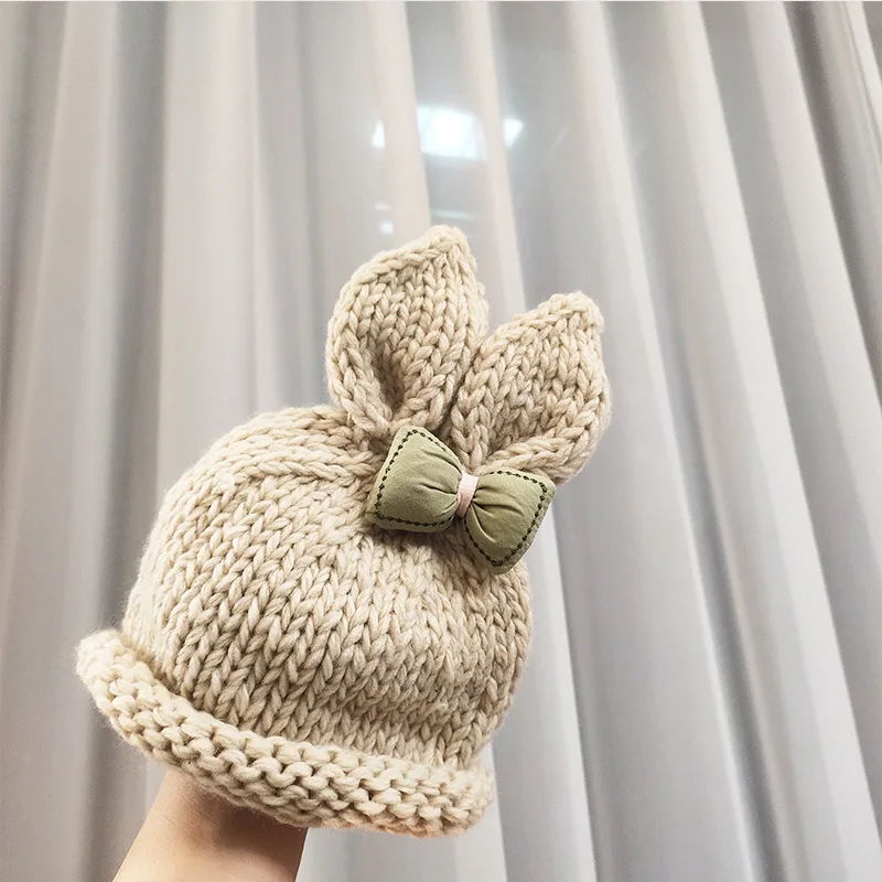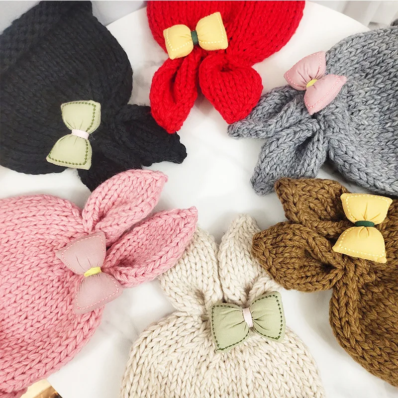 6 шт. однотонная детская вязаная шапка с бантиком и заячьими ушками