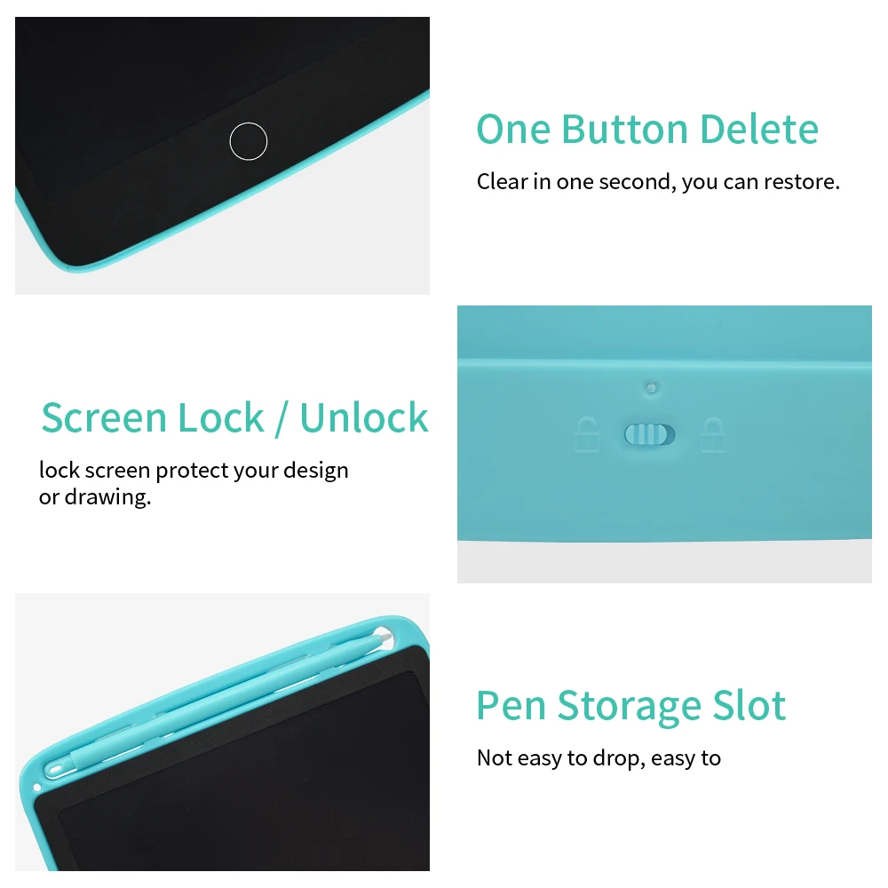 1. Блокировка экрана и удаление ключа: встроенный ключ блокировки экрана, чтобы избежать случайного стирания во время записи. Не беспокойтесь о потере важного изображения или данных. Одна кнопка легко и быстро стирает содержимое с помощью кнопки стирания. 2. Легко и весело в использовании: так же просто, как с помощью блокнота, вы можете рисовать и писать что-нибудь на нем. Дети могут получить все удовольствие без беспорядка после слов! 3. Легкий и портативный: вес нетто только 145g с пером (Около 5,1 oz). Легко брать в сумочку, планировщик, портфель или рюкзак в любое время и в любом месте. 4. Экологичность и экономичность: доска для рисования экологична и не загрязняет окружающую среду. Он может стираться Более 100000 раз. Только когда вы нажимаете кнопку стирания, это вызовет энергопотребление. Аккумулятор может работать до 1-2 лет, и вы можете легко изменить его. Вам больше не нужно покупать бумагу и ручки, экономить бумагу и деньги. 5. Лучший подарок для детей и взрослых: высококачественный ЖК-экран позволяет линии быть более гладкими и четкими. Нет пыли, нет излучения, нет бликов, защищает ваши глаза. Тренируйте детские навыки рисования и письма. И хороший помощник для работы. Это идеальный подарок практически для любого случая, включая дни рождения, Рождество, Новый год или любой другой случай, о котором вы можете подумать!