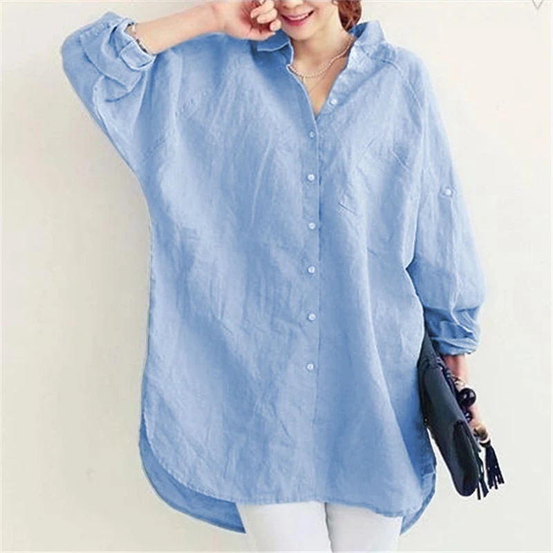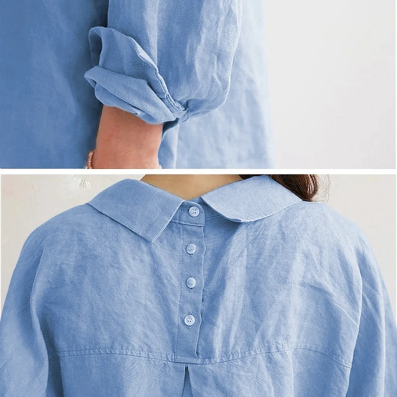 Женская Повседневная Свободная блузка из хлопка и льна, Офисная женская элегантная рубашка с длинным рукавом, топы синего цвета XXL