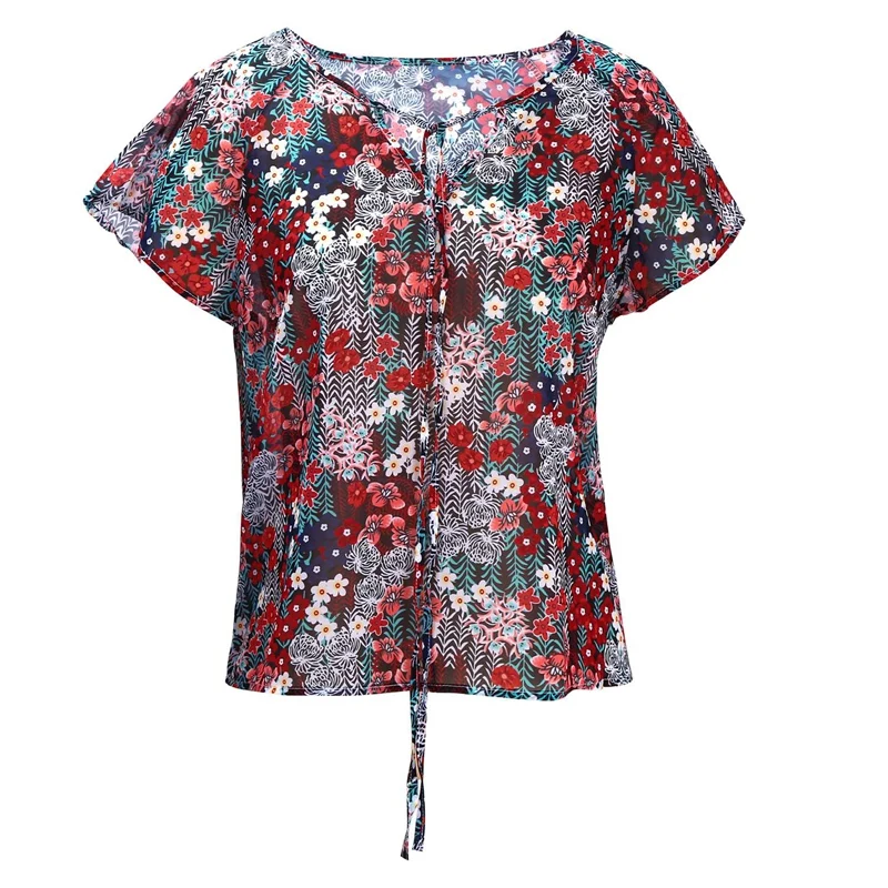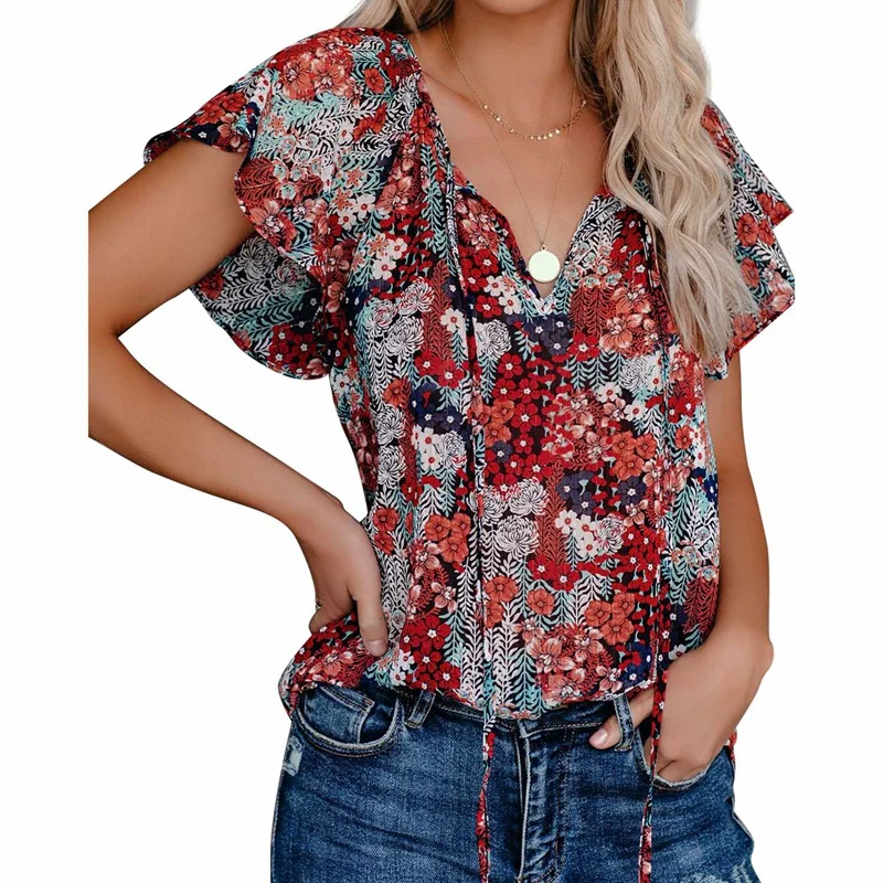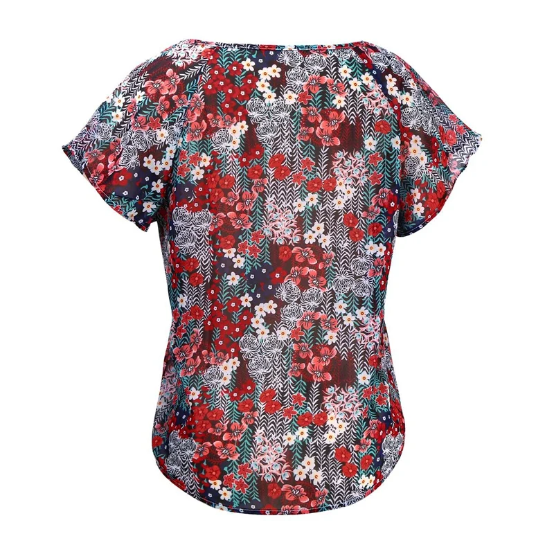 Женская летняя рубашка с цветочным принтом и v-образным вырезом, Красная футболка с коротким рукавом, размер XXXL