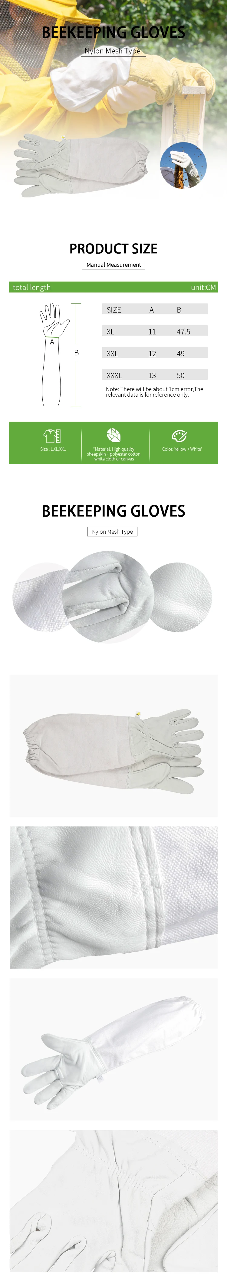 Параметры: Состояние на 100% абсолютно новый Тип изделия: перчатки для пчеловодства Материал: Овчина + парусина + сетчатые леггинсы Цвет: желтый Использование: защита от пчелы Количество: полный комплект одежды из 2 предметов Вес: прибл. 108 г Окружность руки: прибл. ≤ 22 см/8,66 дюймов Посылка: 2 х перчатки для пчеловодства