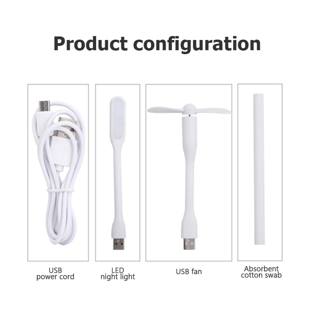 Посылка включает в себя:USB шнур питания, светодиодный светильник, USB вентилятор, впитывающий ватный тампон;