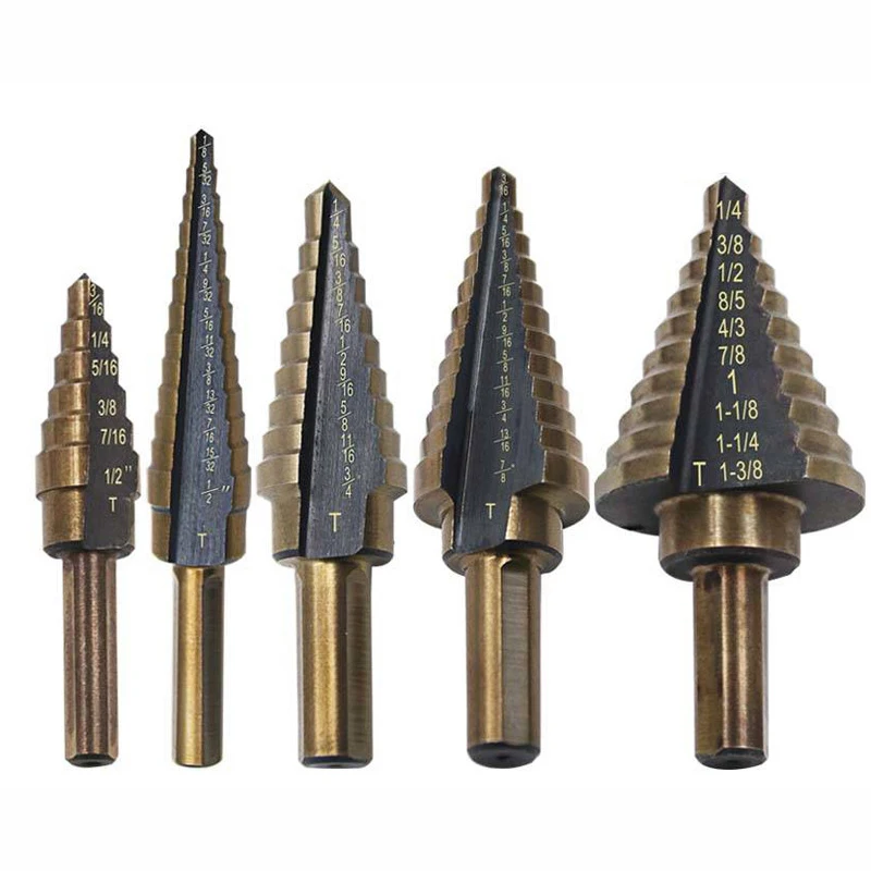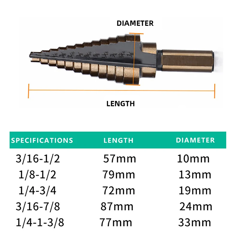 Набор ступенчатых сверл включает пять стандартных ступенчатых сверл HSS, которые могут заменить 50 отдельных сверл. Сверло можно использовать в качестве замены нескольких сверл для удовлетворения различных потребностей. С пятью ступенчатыми сверлами, которые мы предлагаем, вы можете обработать 50 различных видов отверстий диаметра, что значительно экономит вам много проблем и пространства. Это означает, что 50 размеров сгущены на пять, что делает бурение более простым и практичным.