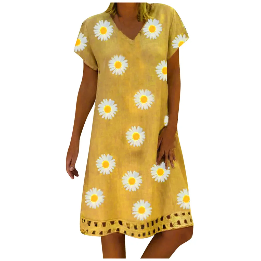 Женское летнее платье, винтажное свободное платье миди с v-образным вырезом и цветочным принтом с коротким рукавом