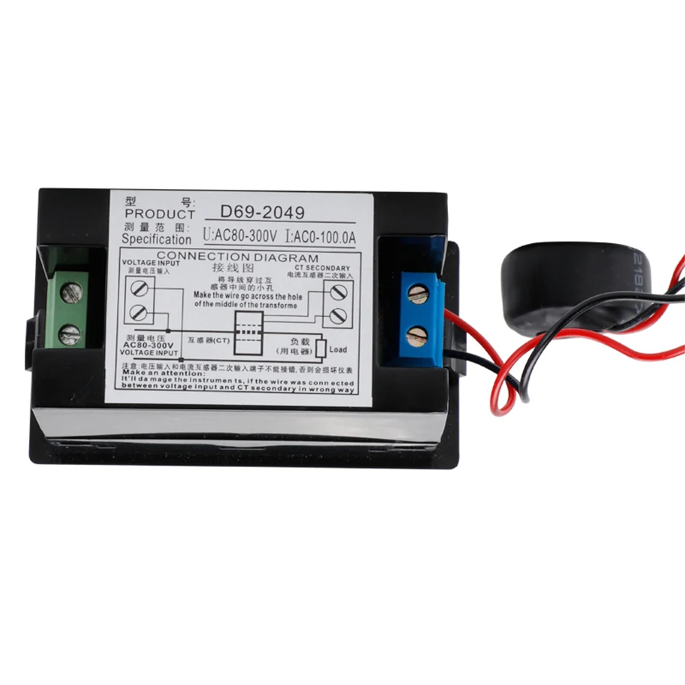Трансформатор тока:Поставляется с номинальным током 0-100 А, измеритель позволяет легко и хорошо измерять потребление тока, за пределами самого электронного устройства. Просто проведите провод через отверстие трансформатора.