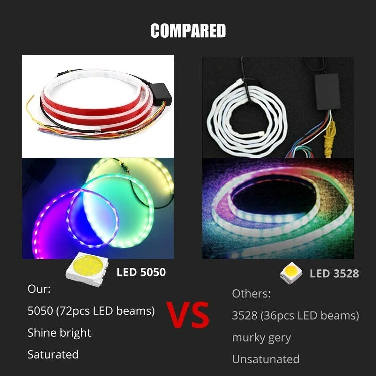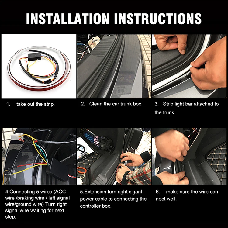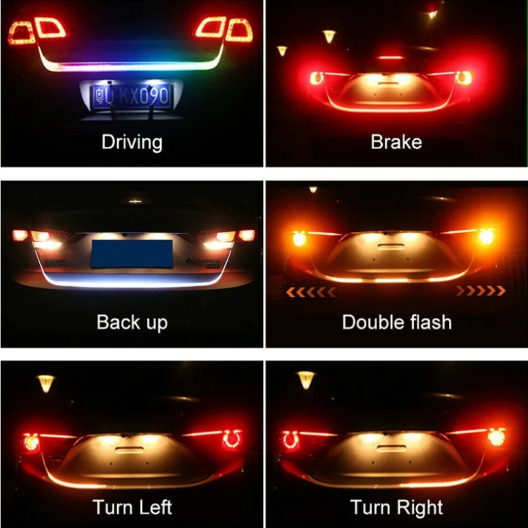 1.Item type: LED dynamic streamer trunk strip 2.Voltage: DC12V 3.Light Source: 5050 LEDs 4.Color: RGB / Amber/ White/ Red /Ice blue 5.Length:121cm/ 47.6inch 6.Weight: 0.18kg 7.Application: Tail gate trunk 8.Funtions: driving mode colour is RGB (Dynamic streamer colors drifting/water Flowing). *When braking model, colour is Red (Flash 3 times and then red light). *When turn left signal , colour is Yellow (Dynamic streamer colors flowing from left to right). *When turn right signal , colour is Yellow (Dynamic streamer colors flowing from right to left). *When double flash , colour is Yellow (Dynamic streamer flowing from middle to both to side). *When Reverse gear, colour is White..