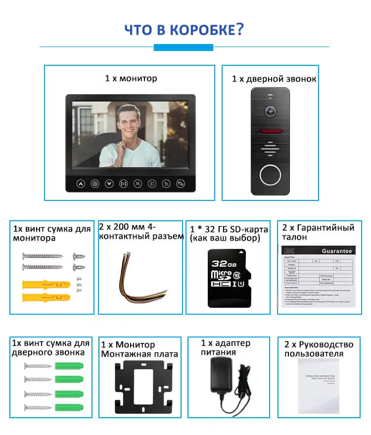 1 x Монитор 1 х дверной Звонок 2 x Руководство пользователя 1x32 Гб sd-карта 1 х адаптер питания 2 x гарантийная карта 1 х винтовой мешок для монитора 1 х Винтовая сумка для дверного звонка Монтажная пластина для монитора-1 шт. 2x200 мм 4-контактный разъем