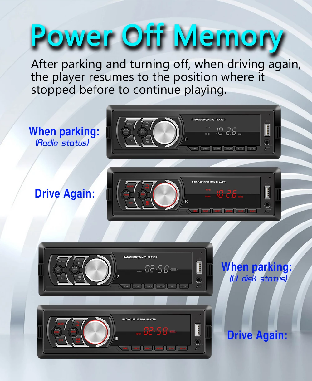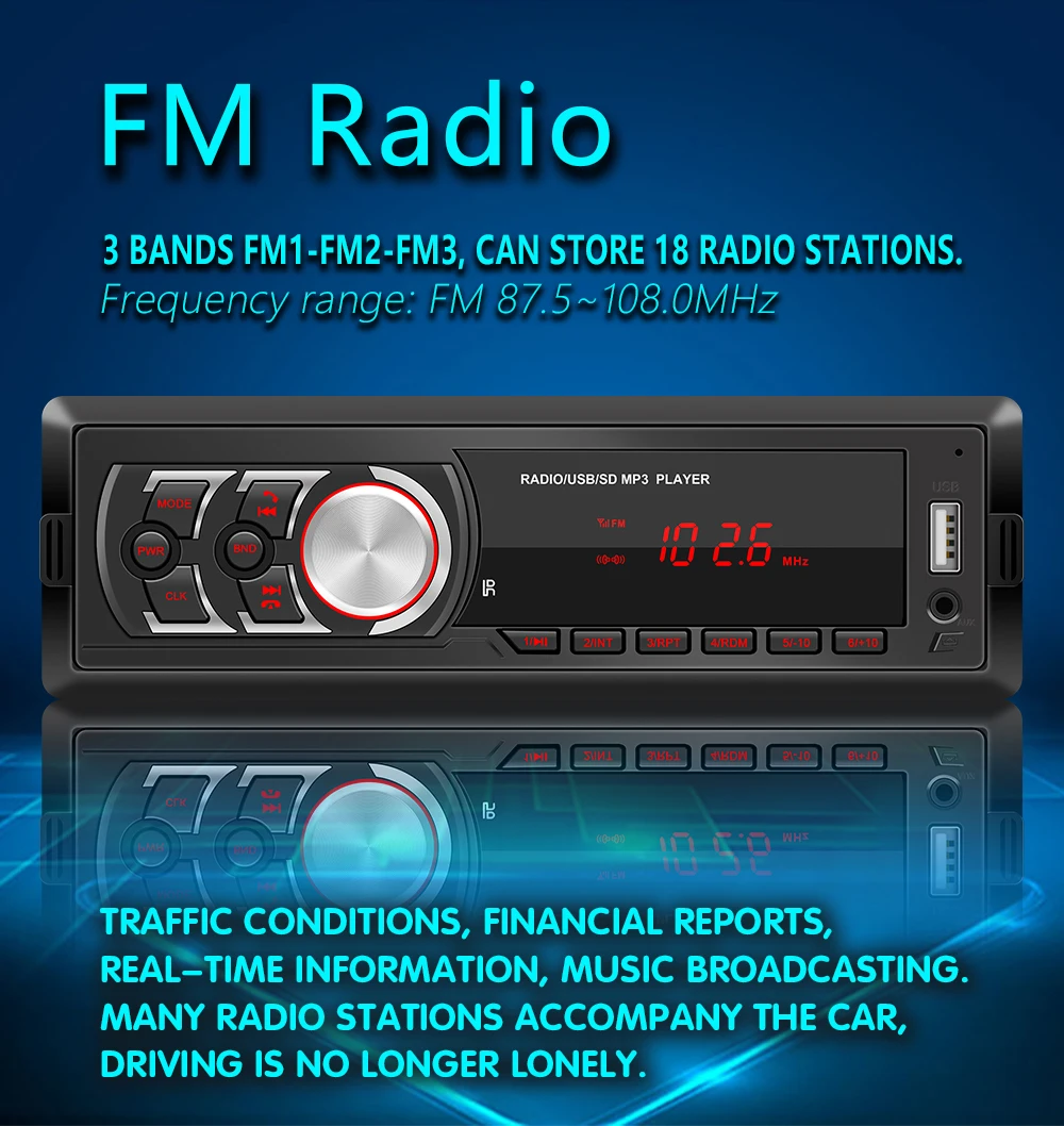 Особенности 1.USB интерфейс поддерживает мобильный телефон, воспроизведение музыки, вам нужно только подготовить зарядный кабель в автомобиле 2. Отключение питания с функцией автоматического хранения памяти в режиме радио или SD/USB/AUX 3. Многофункциональное ИК-рулевое колесо с дистанционным управлением, бесшумное управление 4. Функция Bluetooth: можно подключить телефон, чтобы держать руки свободными при звонке, кроме того, вы даже экономите сумму денег, чтобы купить бизнес-наушники 5. Стерео звуковые эффекты: Встроенный мощный IC приносит стерео звуковые эффекты, позволяя вам испытать удовольствие от вождения 6. Fm-радио: Высокочувствительный тюнер, поддержка FM (87,5 ~ 108,0 МГц) стерео настройки, 3 диапазона (FM1 ~ FM2 ~ FM3), может храниться 18 радиостанций