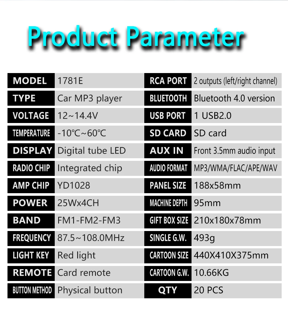 Особенности Напряжение: 12 В постоянного тока Максимальная выходная мощность: 25 Вт Чип усилителя мощности: YD1028 FM частота: 87,5 МГц ~ 108 МГц Формат аудио: MP3/WMA/WAV/FLAC Расширение карты памяти: Макс 32G Порт USB: 2,0 Мобильный телефон зарядка: Поддержка Радиосвязь: FM1/FM2/FM3 Слот для карты: TF карта Рабочая температура:-10 ℃ ~ 60 ℃ Порт RCA: 2-канальный аудиовыход GPS карта: не поддерживает Ключевое слово заводской настройки: не поддерживает Формат видео: не поддерживает Формат изображения: не поддерживается Размер панели: 188*58 мм Светильник панели: Красный светильник Одиночная Машина: 493 г Мобильный телефон подключение: не поддерживается Gps-навигация: не поддерживается Радиочип: Интеграция чипов Язык: нет Рабочая температура: -10 ~ 60 градусов