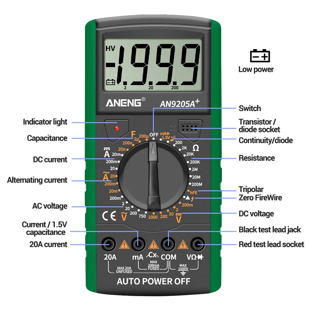 -Широкое применение: измерение напряжения постоянного тока, измерение напряжения переменного тока, Измерение тока постоянного тока, измерение переменного тока, измерение емкости, измерение сопротивления, обнаружение непрерывности, измерение триода, проверка нулевой/огневой проволоки и измерение диодов.