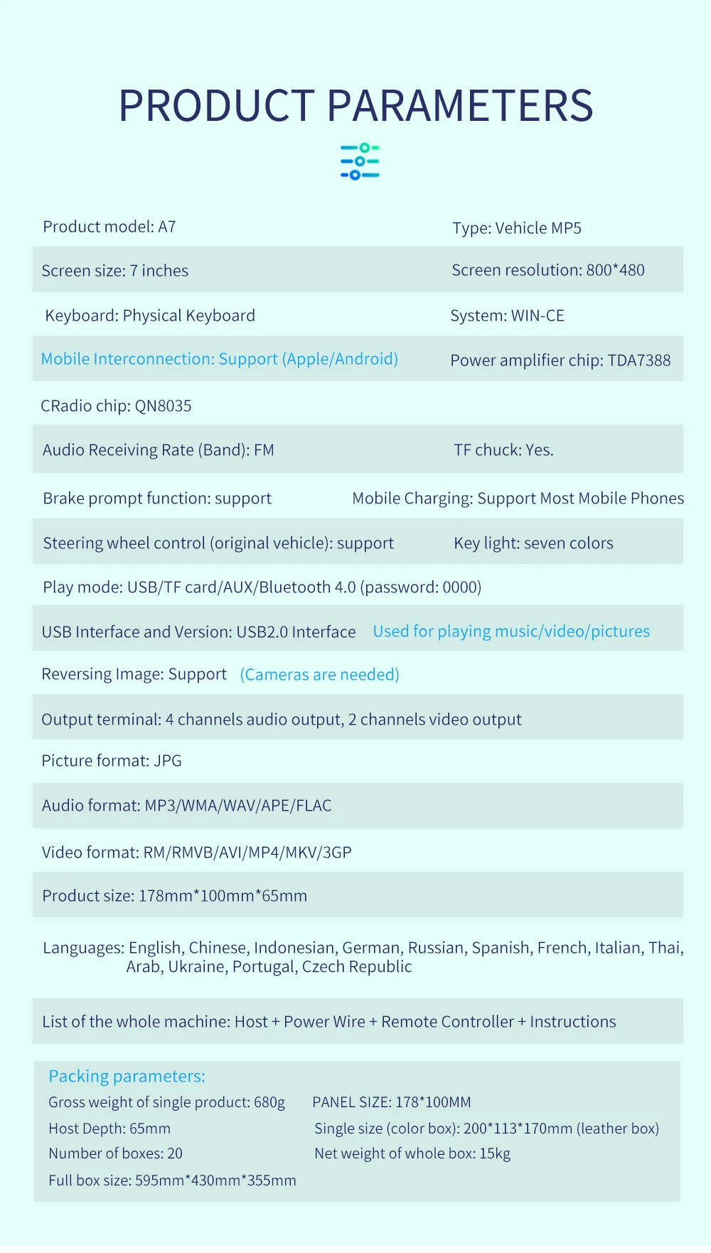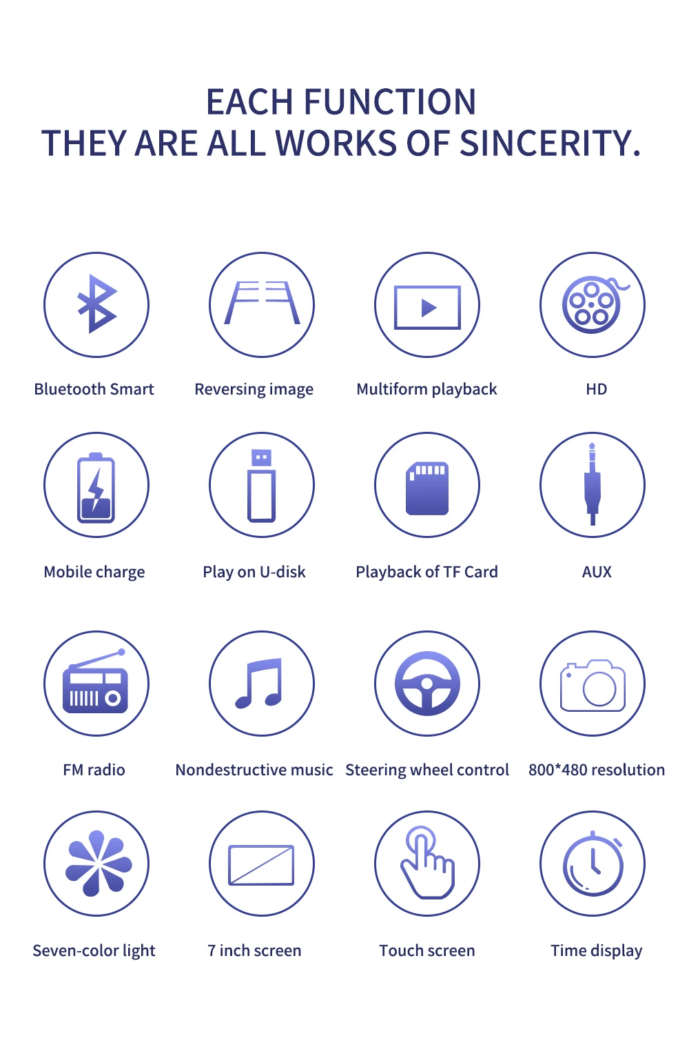 1. Размер сенсорного экрана: 7 дюймов Поддержка зеркальной связи: Мобильный интернет поддерживает функцию обмена данными на Android мобильный телефон. Так как он очень строгий с кабелем передачи данных. Пожалуйста, используйте оригинальный usb-кабель для телефона. (новая функция) 2. Напряжение: 12 В постоянного тока 3. Сопротивление динамика: 4 Ом 4. Максимальная мощность: 50 Вт * 4 5. Регулятор громкости: +/-8 дБ (бас 100 Гц ВЧ 10 кГц) 6. Диапазон настройки FM: Диапазон настройки: 87,5-108 МГц Применимая Чувствительность: 15 дБ SNR: 50 дБ Стерео Разрешение: 30 дБ 7. Система парковки автомобиля. Он автоматически превратится в режим парковки, записывает движение. (камера заднего вида в комплект не входит) 8. Высокое разрешение: 1080P Full HD. 7-дюймовый сенсорный ЖК-экран дает вам фантастический опыт просмотра hd-видео. Поддержка формата воспроизведения видео AVI/MP4/FLV/PMP/RM/RMVB/MPG. 9. Функция Bluetooth: Встроенный Bluetooth для беспроводной потоковой передачи звука, встроенный микрофон для громкой связи. Решить вашу проблему вызова, когда вы едете. Что еще? Подключите телефон к функции bluetooth, поднимите звуки вашего GPS и ваших любимых песен в автомобильном динамике. 10. Многофункциональность: высокий ток USB выход, можно заряжать мобильный телефон Играйте в роли MP3, MP5 плеера, радио, датчика парковки и т. д. это ваш лучший выбор для вашего автомобиля.