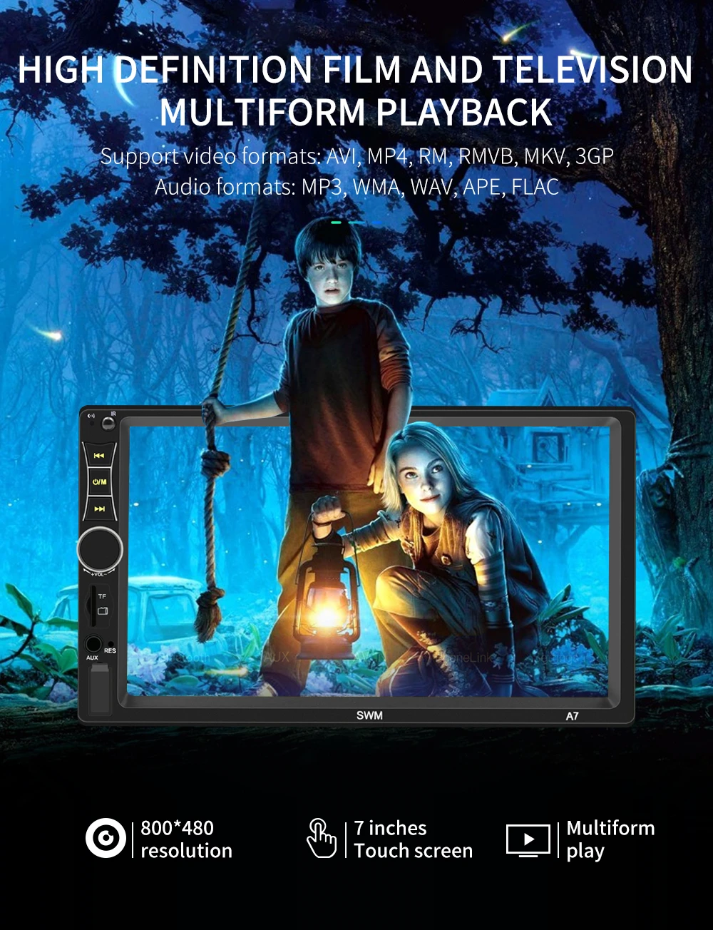 Поддержка видео форматов: AVI, MP4, RM, RMVB, MKV, 3GP Аудио форматы: MP3, WMA, WAV, APE, Разрешение: 800*480 Сенсорный экран: 7 дюймов Многоформовая игра