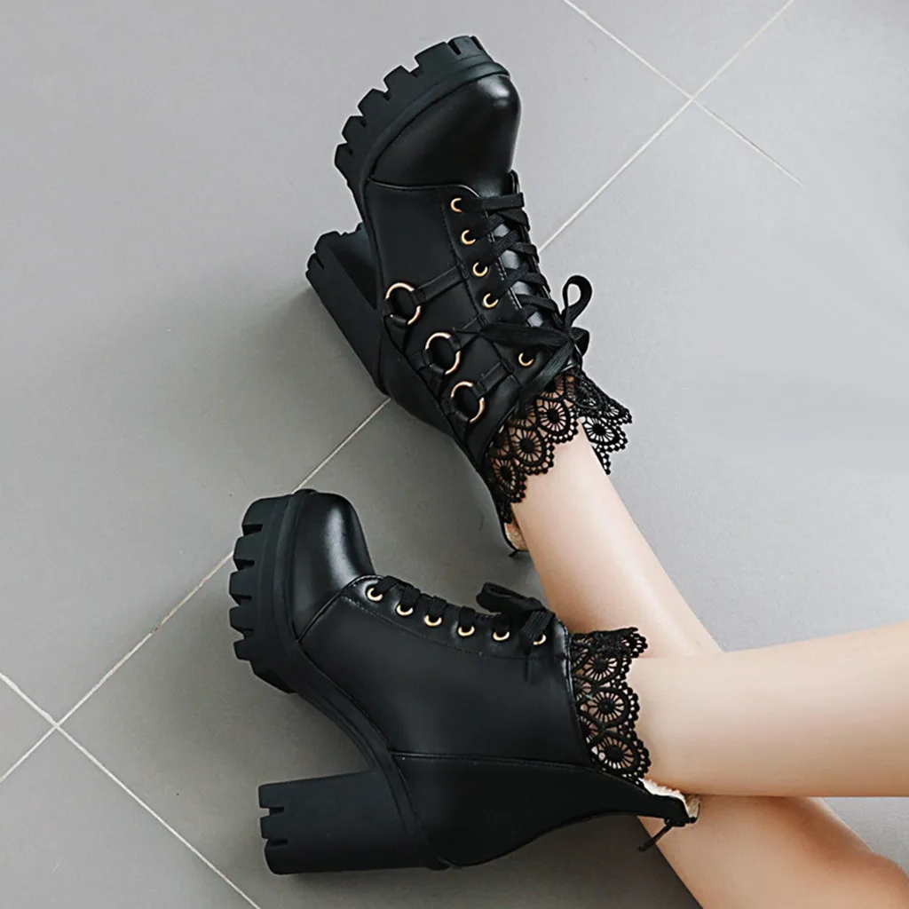 Модные зимние однотонные женские ботильоны на высоком каблуке с кружевом; Вечерние туфли