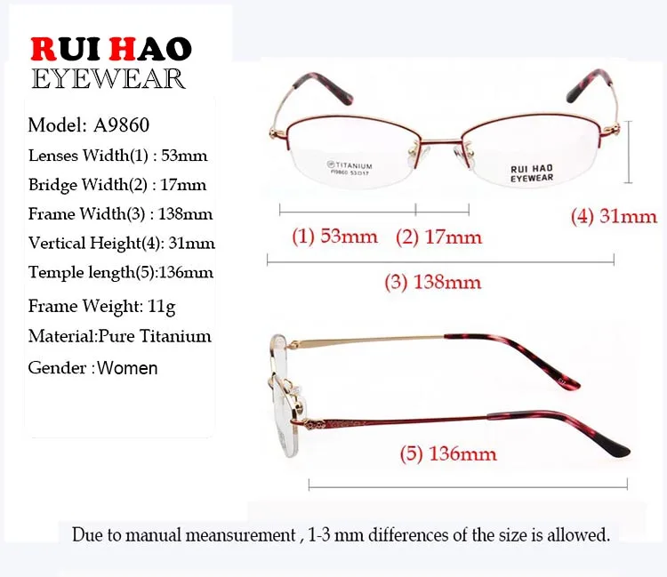 Номер модели: 9860 Бренд: RUI HAO EYEWEAR Пол: женщин Стиль: оптическая рамка Материал: титан Состояние: новое Вес: 11 г Линзы: прозрачные демонстрационные линзы (только для украшения) Посылка: 1 оправа для очков,