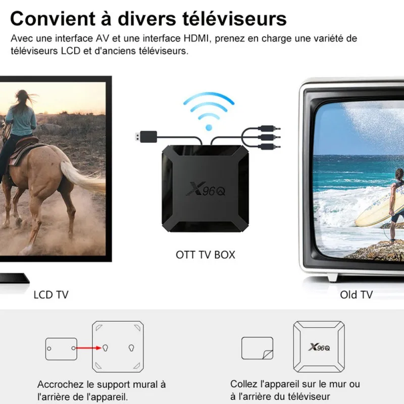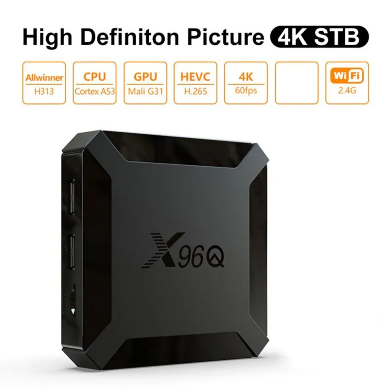 Product presentation: Android tv box android 10 X96Q Smart TV BOX Wifi 2G 16Go H313 4K Multimedia box Android box X96Q 2GB 16GB Model: X96Q Main characteristics CPU: Allwinner H313 Quad Core ARM Cortex A53 GPU: G31 OPenGL3.2 Flash: 1/2 GB SDRAM: 8/16 GB OS: Android 10 Power: DC 5V / 2A USB: 2x USB 2.0 Card reader: 4GB / 8GB / 16GB / 32GB TF cards OSD Languages Type: English French German Spanish Italian etc. multilateral languages LAN: RJ45 10M / 100M Wireless: 2.4G (802.11b / g / n /) WiFi HDMI: HDMI 2.0 up to 4K Output with HDR, CEC and HDCP 2,2, 4K @ 30fps max resolution output Wireless upgrade (OTA) support Support : voice remote control connection Mouse / Keyboard: Mouse and keyboard via USB, 2.4 GHz wireless mouse and keyboard via 2.4 GHz USB dongle