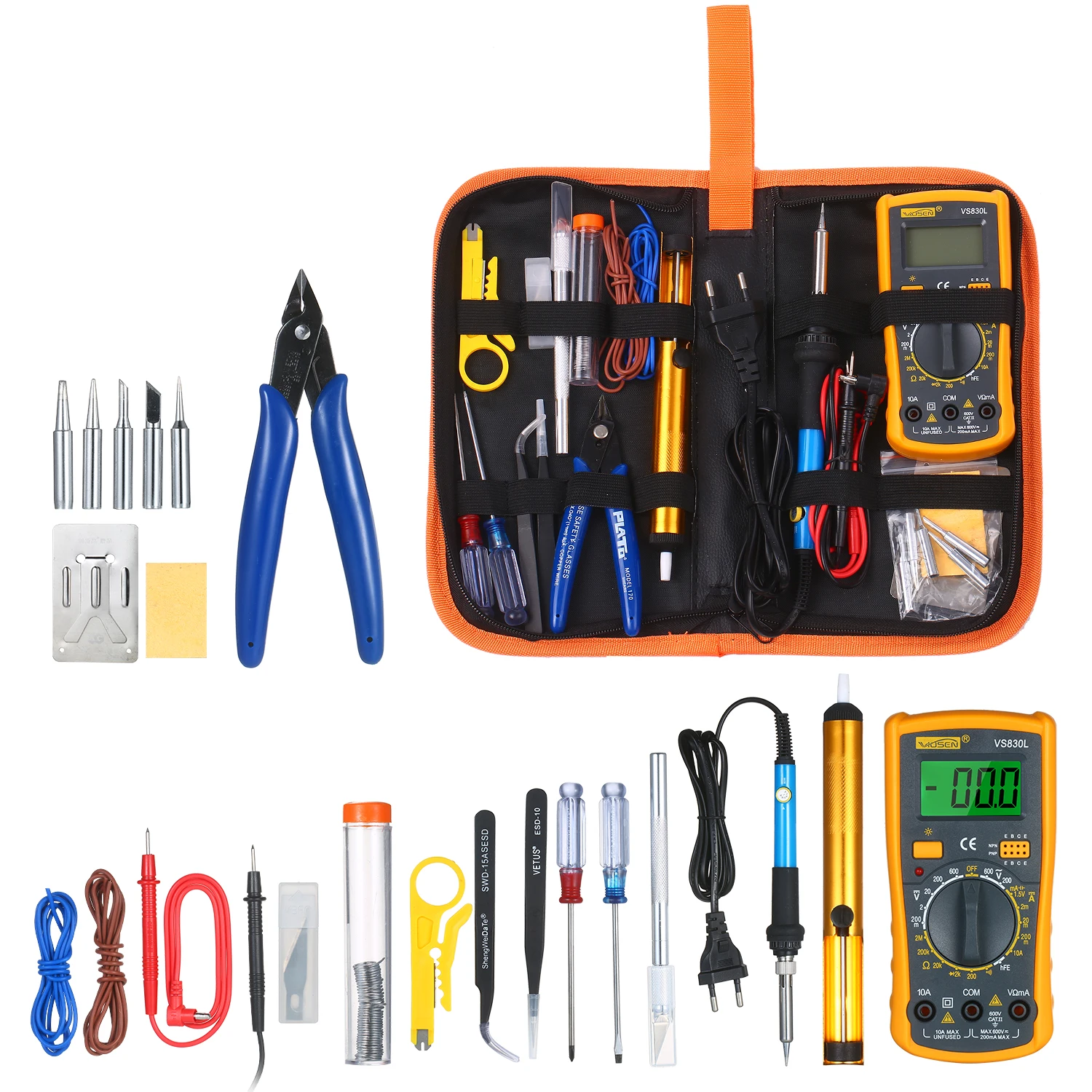 Комплект паяльника может удовлетворить все ваши потребности в паяльной работе со всеми включенными фитингами, паяльником термостата, цифровым мультиметром, демонтажным насосом, пинцетом, оловянной проволокой, паяльной подставкой, железным наконечником, плоскогубцами, мини-зачистки проводов, делает вашу пайку более легкой и удобной. С сумкой для переноски, для хранения небольших инструментов и легко носить с собой. Набор паяльника для различных целей, от дома DIY, электрических ремонтных работ и других проектов пайки.