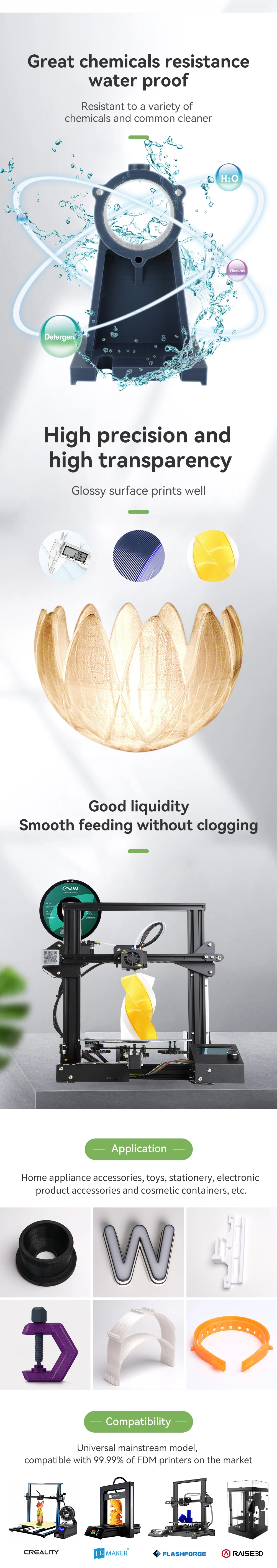 【PETG filament】отличная четкость, светильник и блеск. Высокая прочность. Отличная ударная прочность. Химическая стойкость. Хорошая стабильность. Нет трещин. Без деформации. Экологичный. Нетоксичный и низкий запах.