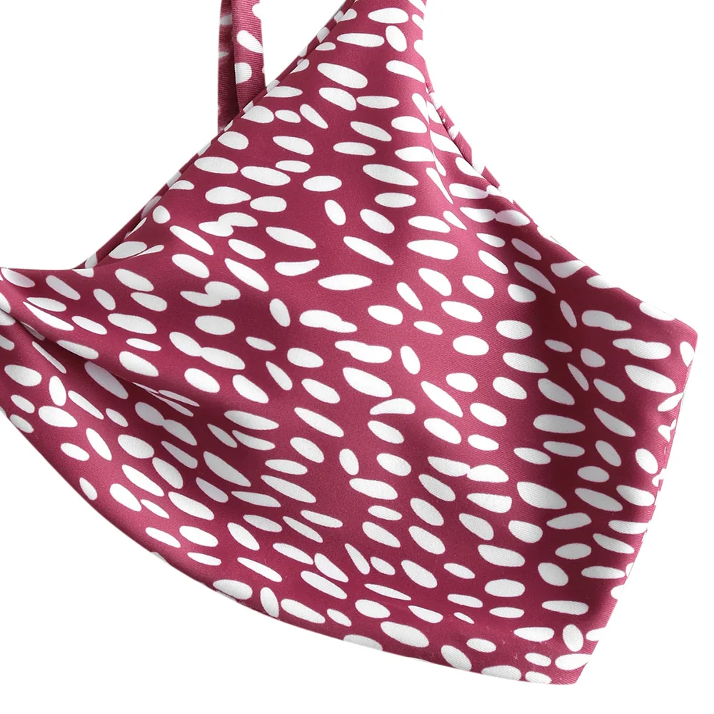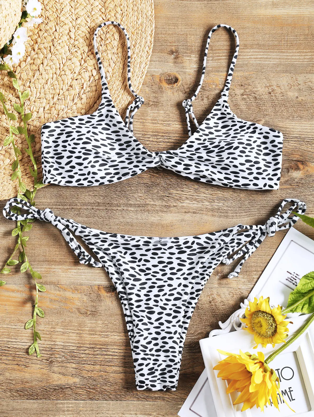 В пикантном, но симпатичном стиле этот комплект бикини с пятнистым рисунком, привлекающий внимание перекручивающий дизайн спереди со съемной чашкой с мягкой подкладкой. Плавки-стринги с завязками по бокам с деталями в форме стрингов. Это будет лучший выбор для вас.