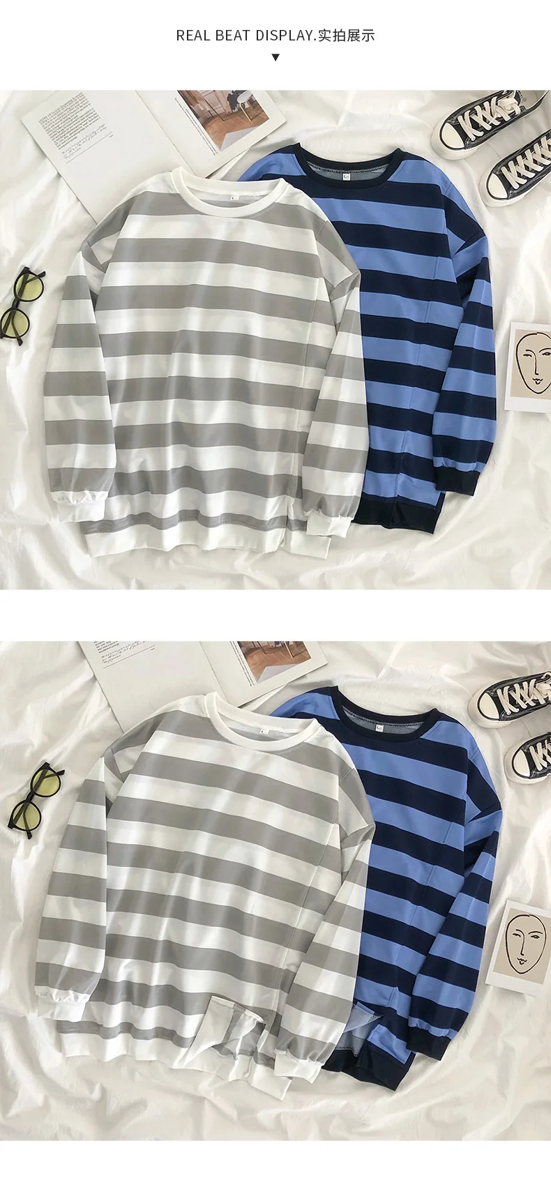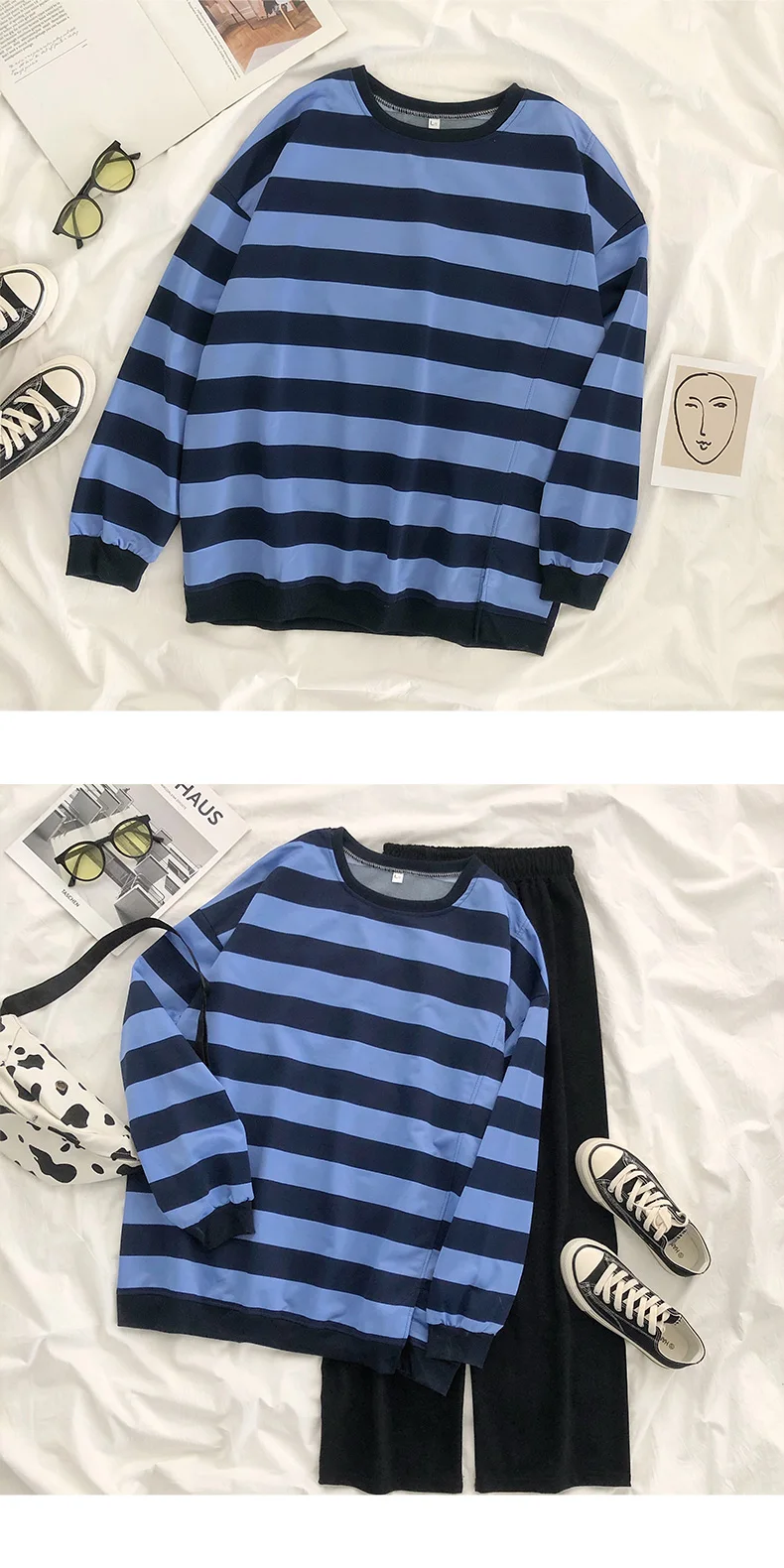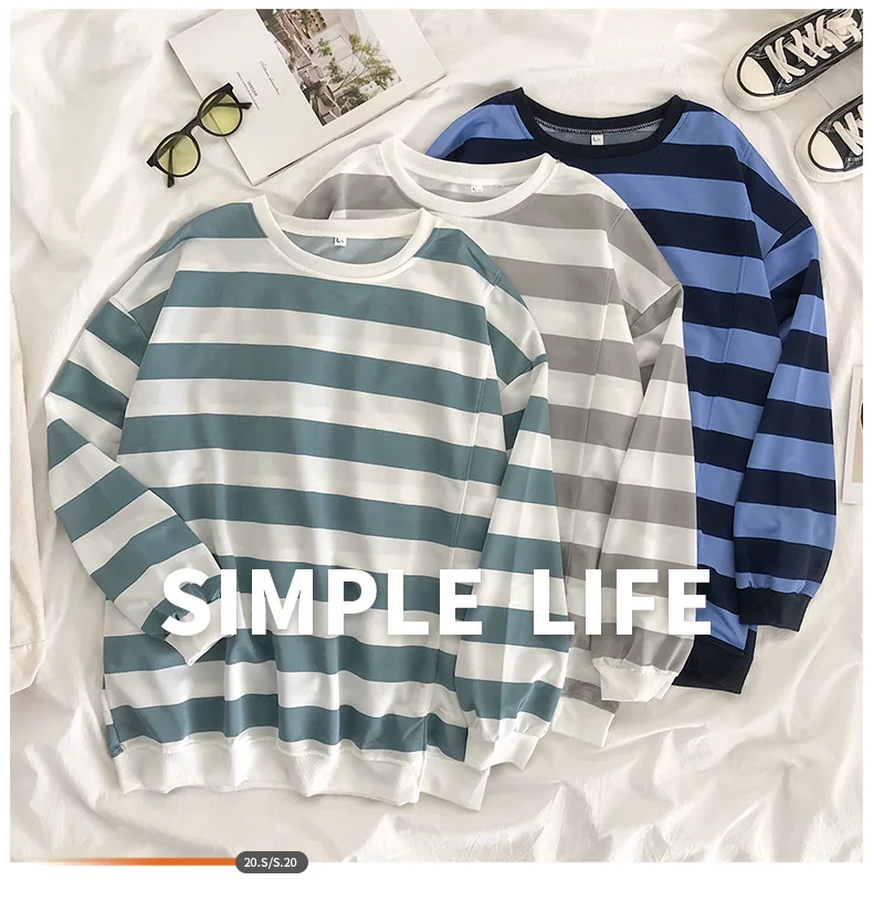 Ранняя осень новая Корейская версия Харадзюку стиль полосатая футболка с круглым вырезом Женская свободная дикая ins парные те же параграфы 2020