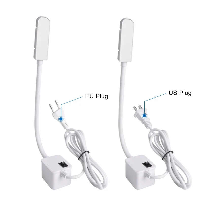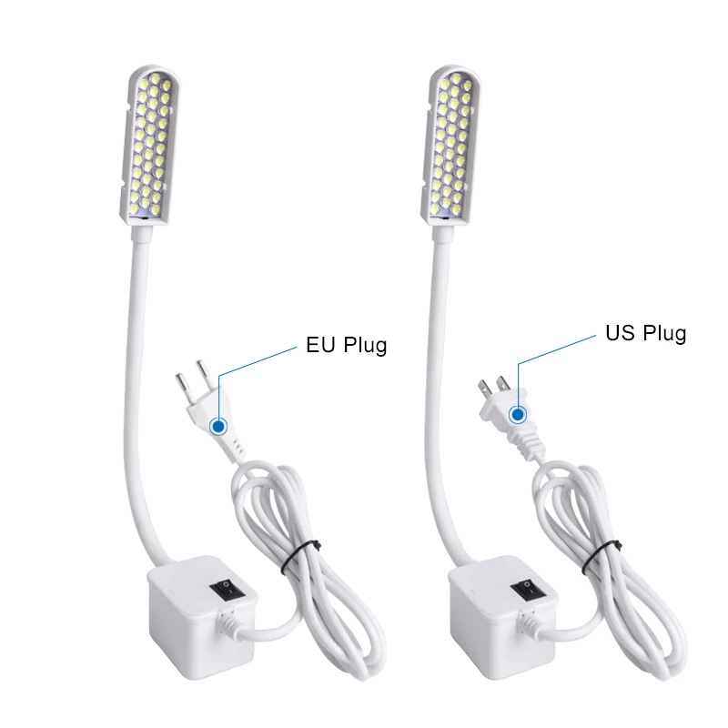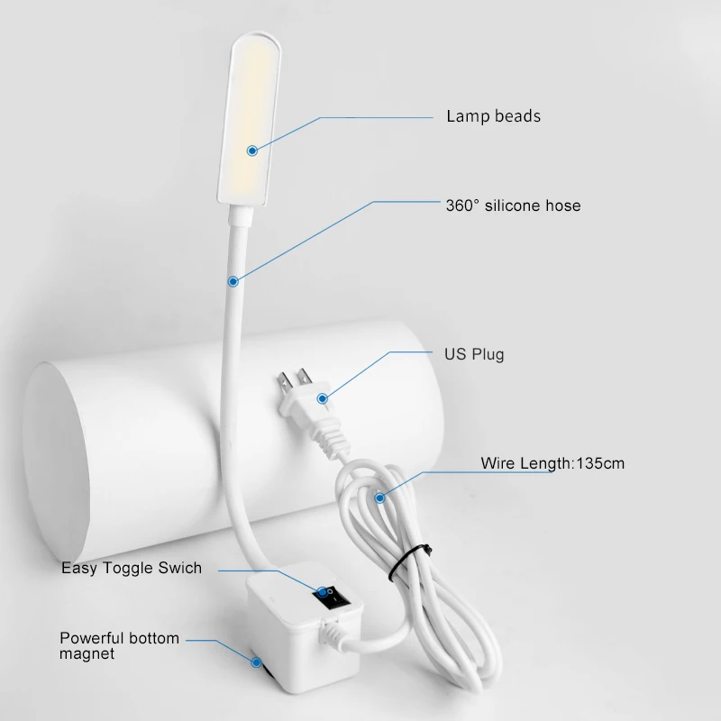 Особенности: Длительный срок службы: срок службы может достигать 50000 часов Светодиодный светильник: высокая интенсивность, близость к солнечному свету, естественный комфорт. Гибкий шланг 360 градусов, многоугловое освещение, гибкий и удобный в использовании. Срок службы переключателя может достигать более 30 тысяч раз В корпусе используется новый материал ABS. Сильная коррозионная стойкость N38 материал сильный магнит, стабильный и безопасный Улучшает блики освещения для снятия усталости глаз и повышения эффективности работы. Спецификация Светодиодный светильник для шитья Мощность: 6 Вт Светодиодный Кол-во: 33 шт/39SMD/COB Вход Напряжение: AC90-260V 50/60Hz Цвет: Дневной свет 6000K С вилкой переменного тока Длина кабеля переменного тока: 1,35 м «Гусиная шея» длиной: 9,5 дюйм (ов) Это сделано для швейной машины, но те из нас, кто работает с электрическими инструментами, могут найти другие варианты использования, кроме швейных машин, таких как сверлильный пресс, токарный станок, фрезерный станок, стол, музыкальный стенд, скамейки и т. Д. Посылка включает: 1 x светодиодный светильник для швейной машины