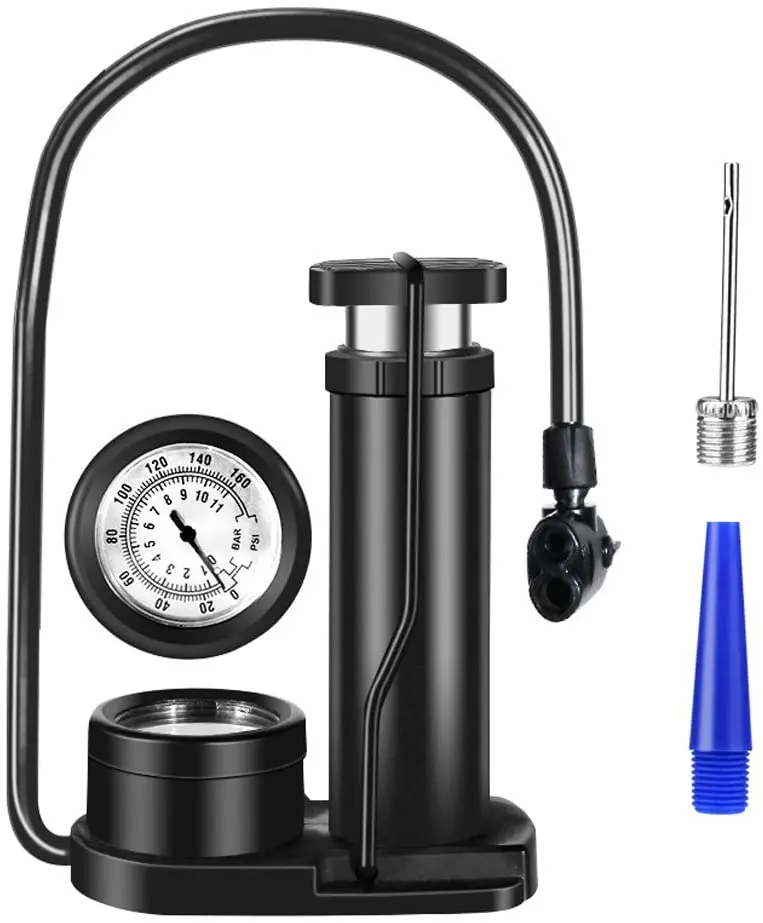 Велосипедный ножной насос с манометром изготовлен из пластика и прочного алюминиевого сплава с двумя клапанами Presta & Schrader, подходит для велосипедов, электромобилей, мотоциклов, шаров, воздушных шаров, плавательных колец, надувных лодок, И т. д. Это идеальный велосипедный насос для конкурентоспособных и социальных гонщиков.
