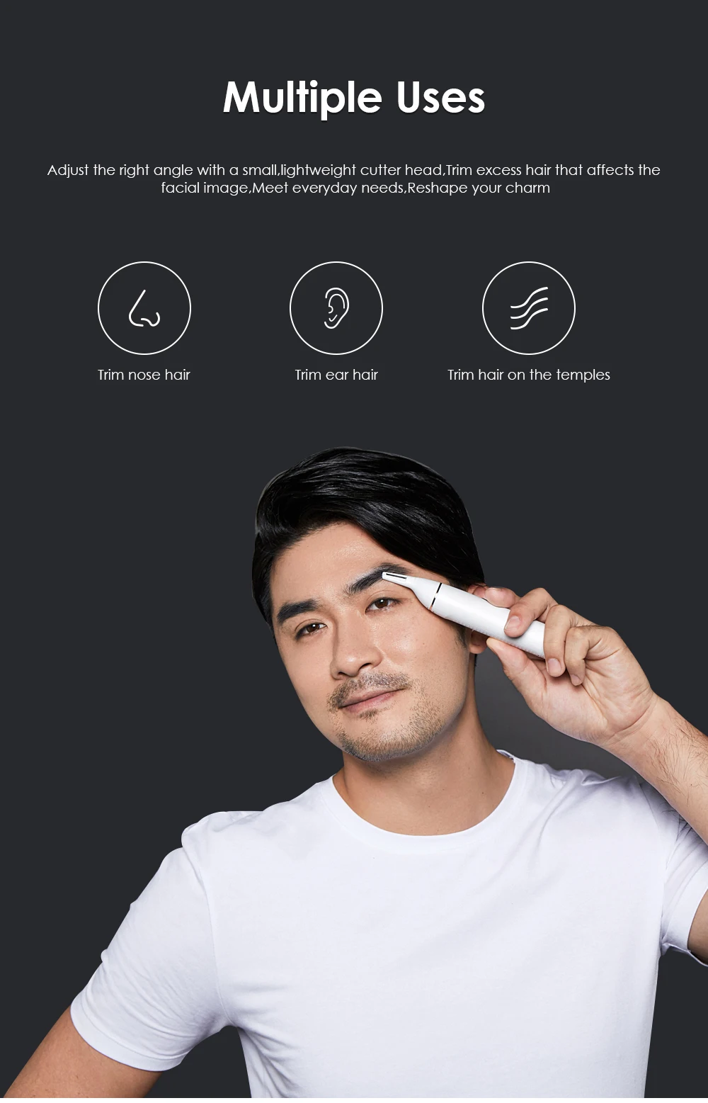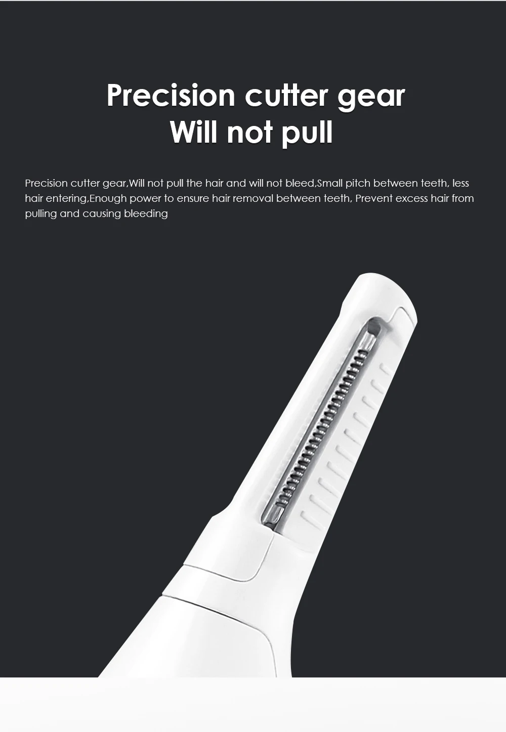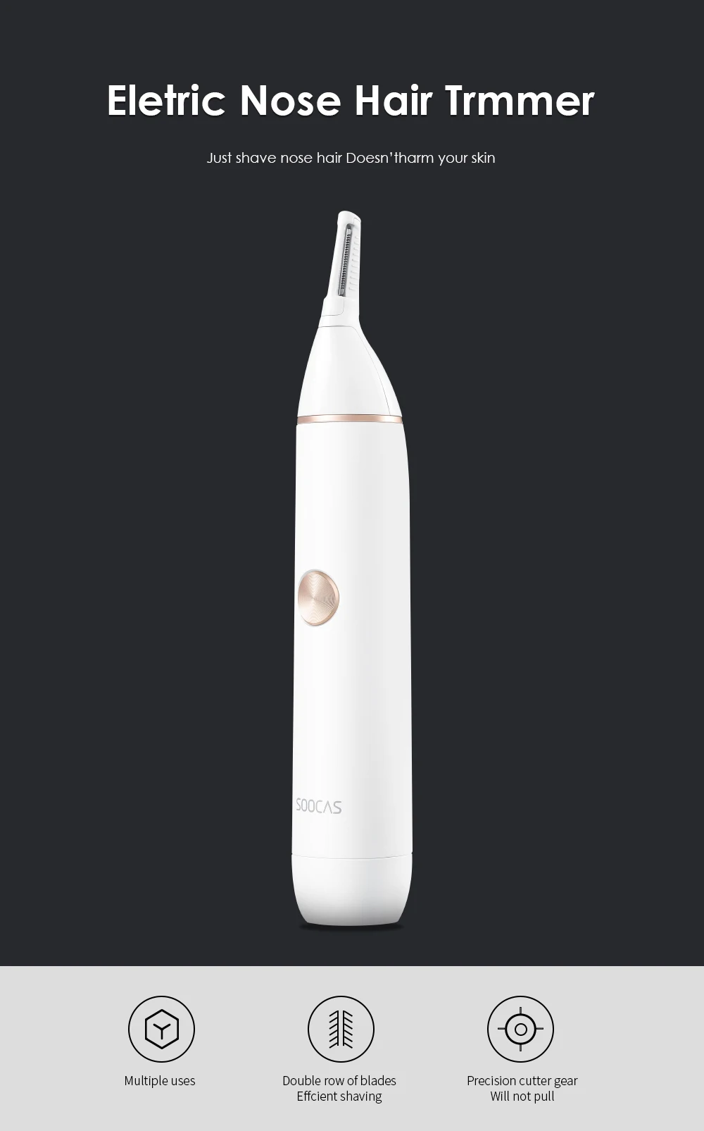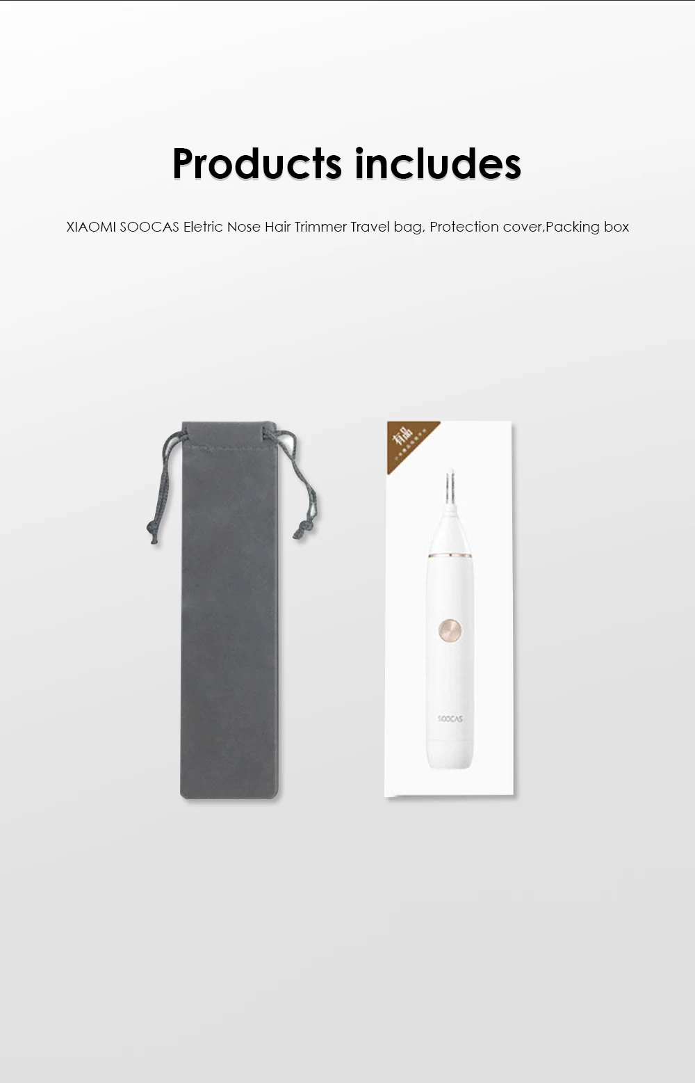 Features: 1. Curved, hypoallergenic and stainless steel blade. 2. Rotary blade system for effective trimming our overgrown nose and ear hair. 3. Cordless operation, comfortable and safe. 4. Smooth, motor provides quick and painless movement. 5. Eliminate the traditional need of scissors to remove the unsightly nostril and ear hair, higher security provided. 6. Rotary blade system with a circular blade action that effectively trims the overgrown hair of your nose or ear wall. 7. Safety cone head guides the hair into the blade and protects the skin from direct contact. 8. Rubber sliding ON / OFF switch, easy to grip. Description: Brand: SOOCAS Condition: New Powered supply: 1 x AA battery (NOT Included). Size: 5.19 x 1.14inch/13.2 x 2.8cm. Material: Plastic shell Color: As Picture How to use: 1 Pushed up the open key 2 Put the trimmer into nostrils, and make rotation cycle action to trim the nasal hair. 3 Close the nose hair trimmer; 4 Cover the shield to prevent damage of the outer foil. 5.Clear cap top to protect the blade when not in use.