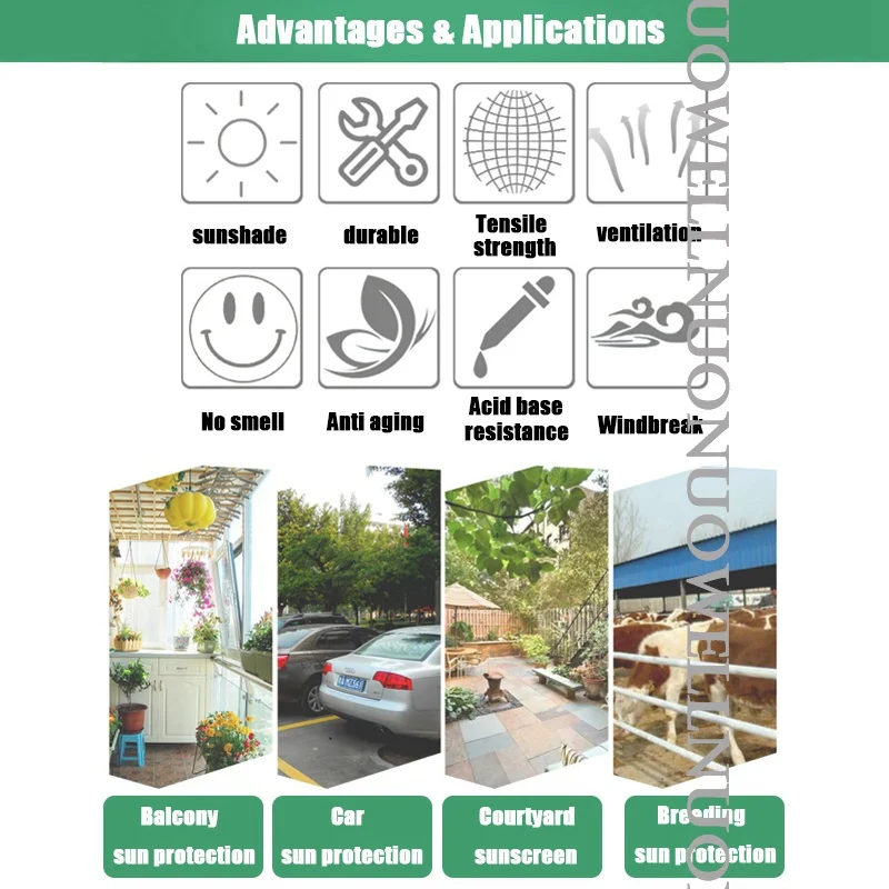 -Название: Солнцезащитная сетка HDPE с защитой от УФ-лучей -Материал: ПНД -Цвет: серый и белый и кофейный и бежевый и хаки -Размер :( пожалуйста, свяжитесь с нами для получения другого размера) -Степень затенения: 90% ~ 95% -Применение: ①Затенение наружного балкона ② Затенение растений ③ Затенение автомобильного сарая ④ Паруса защищают от воды ⑤ Защита от размножения солнца и т. д.