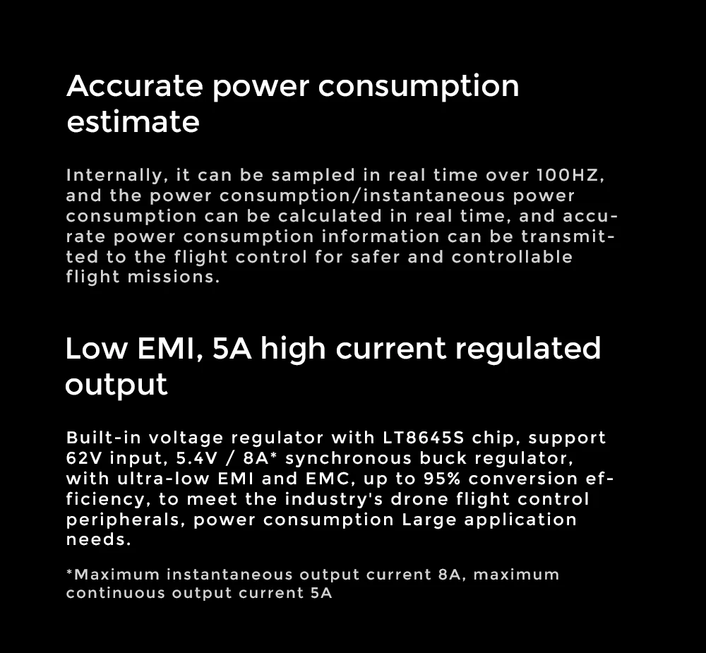 Functions overview CAN PMU is a UAV power management unit module with built-in STM32F4 processor and running CUAV ITT algorithm. It can accurately measure UAV voltage and current in real time. It can support 6-62V voltage and 110A current at maximum, and can output 5.4V 8A. The flight controller is powered by CAN bus communication and supports the standard UAV CAN protocol. Each PMU unit is factory calibrated to ensure good consistency and high accuracy Notes - Please read the product manual carefully. - Please check the connection carefully before connecting the battery - Please use at rated voltage, current and power - Please read the documentation center for configuration and use - Do not disassemble