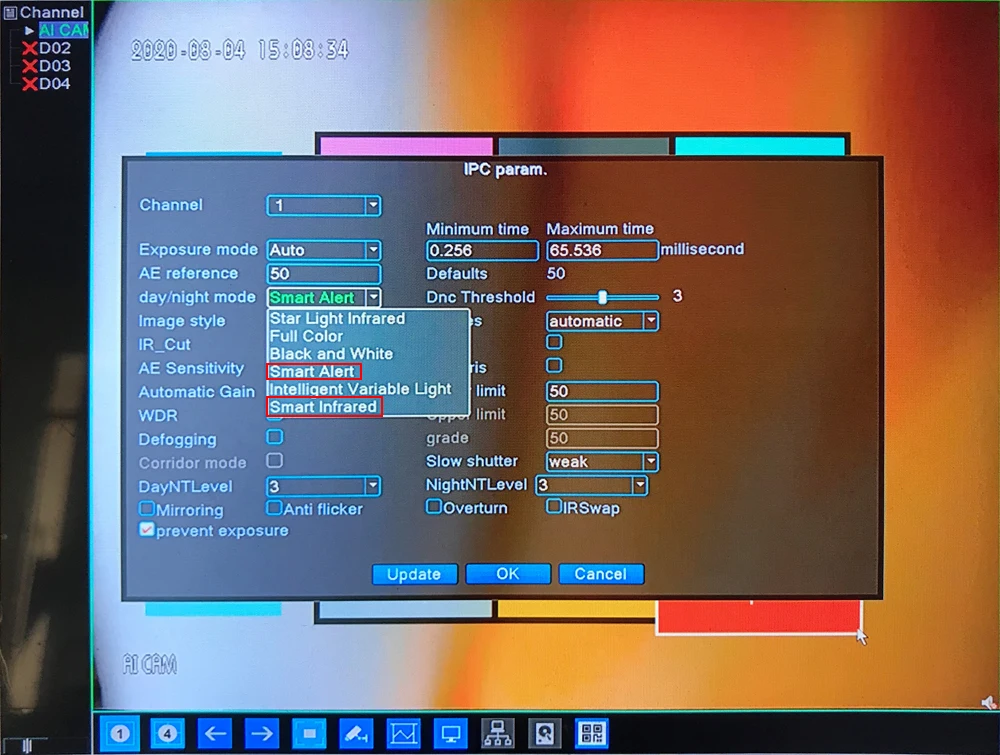 Есть только 2 варианта (другие опции не работают): «интеллектуальное оповещение» и «интеллектуальная инфракрасная» модель. Умное оповещение: при движении камера будет светильник с 4 светодиодами. Умный Инфракрасный: при движении камера 4 светодиода не будет светильник
