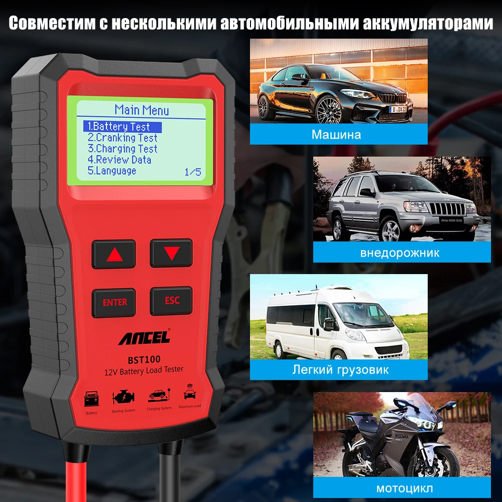 Тестер батареи Ancel BST100 используется для свинцово-кислотного пускового аккумулятора, а также для проверки следующих условий аккумулятора, запуска, зарядки и загрузки. Благодаря отличному дизайну, простоте в эксплуатации, точному считыванию, полным функциям этот тестер обеспечивает показания большим ЖК-дисплеем и подает подсказки звуком и светом при тестировании. Это если использует 4-проводной Кельвина способ, чтобы завершить сбор ряда сложных данных для расчета каждого типа тестирования данных со встроенным точным и улучшения цифровой процессор. Кроме того, некоторые улучшения цепи, включая Полярную защиту от разворота, защиту от перенапряжения, обнаружение свободного свинца, обеспечивают безопасность и удобство во время тестирования. Таким образом, это лучший инструмент в области продаж аккумуляторов, ремонта автомобилей и проверки батареи в системе оборудования, связанных с свинцово-кислотным пусковым аккумулятором.