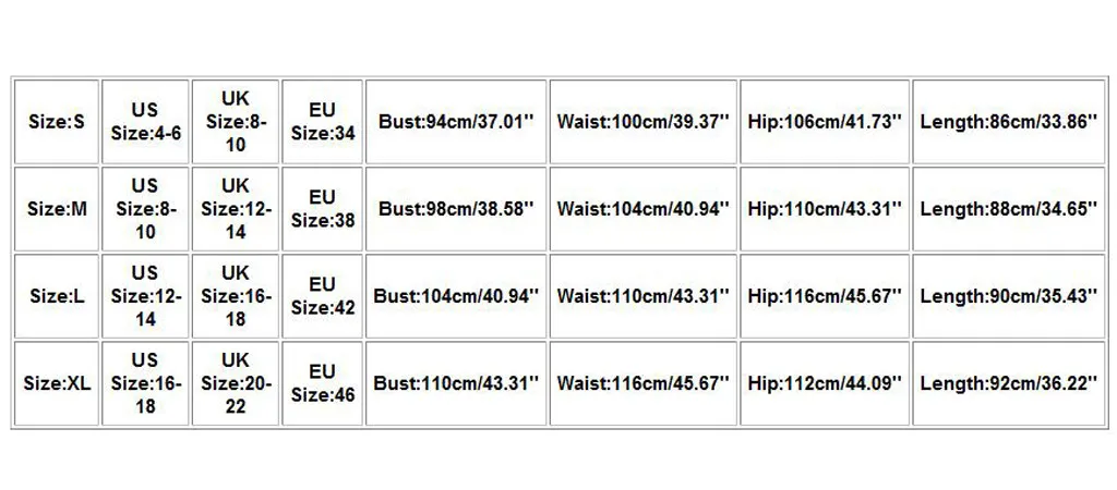 Размер Американский размер Размер Великобритании Европейский размер Бюст Талия Бедра Длина S 4-6 8-10 34 94 см/37,01'' 100 см/39,37'' 106 см/41,73'' 86 см/33,86'' М 8-10 12-14 38 98 см/38,58'' 104 см/40,94'' 110 см/43,31'' 88 см/34,65'' L 12-14 16-18 42 104 см/40,94'' 110 см/43,31'' 116 см/45,67'' 90 см/35,43'' XL 16-18 20-22 46 110 см/43,31'' 116 см/45,67'' 112 см/44,09'' 92 см/36,22''