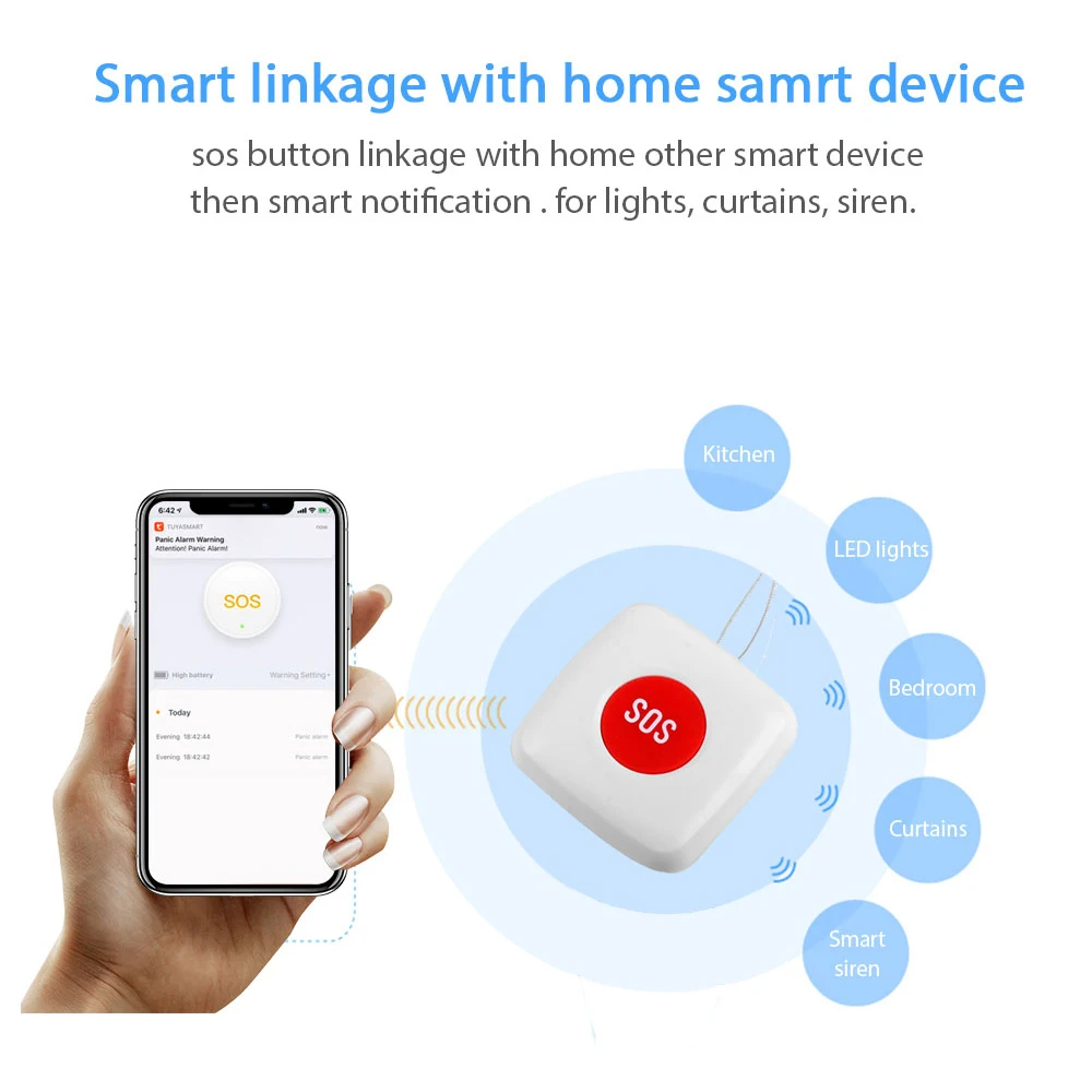 * Кнопка связи ZigBee Tuya SOS с домашними другими смарт-устройствами, такими как огни, шторы, сирена, а затем уведомления нажимаются. Дизайн с низким потреблением, который может сделать его работать долгое время.