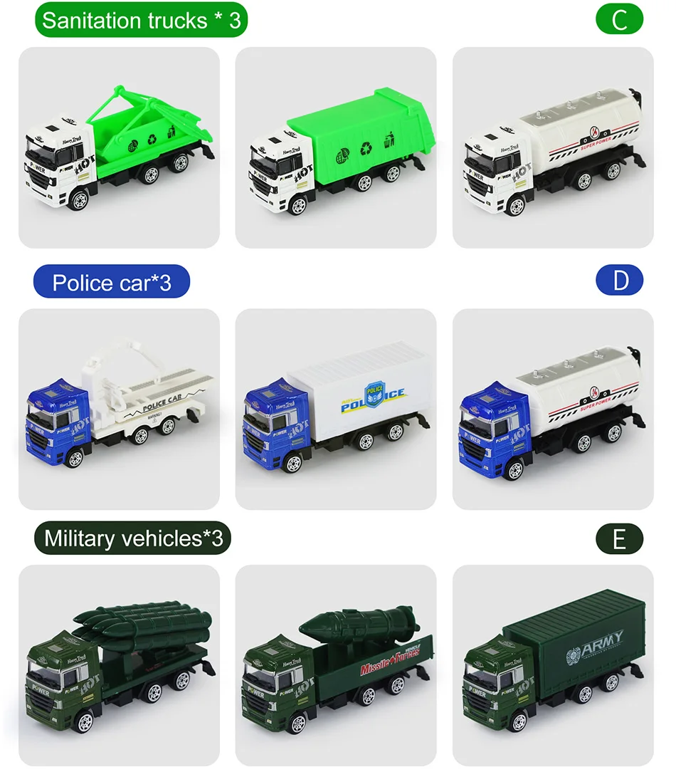 -Безопасный и нетоксичный, изготовлен из надежного и экологически чистого материала. -Идеальные игрушки для детей, которые развивают моторику. -Дети могут создавать различные сцены, не утомляют играть в них. -Подходящий размер-подходит для маленьких детей, легко захватывается. -Пять различных комплектов могут быть выбраны: пожарные/полицейские/инженерные/санитарные/Военные грузовики