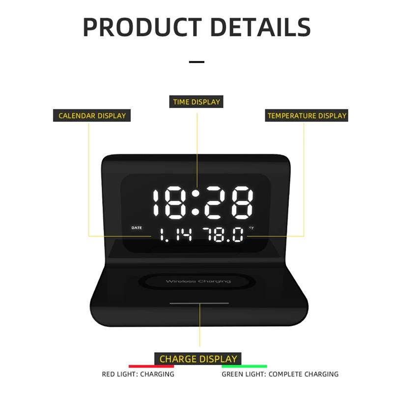 Беспроводное зарядное устройство с цифровым светодиодный Будильник Настольные Цифровые часы с термометром HD Часы с памятью времени