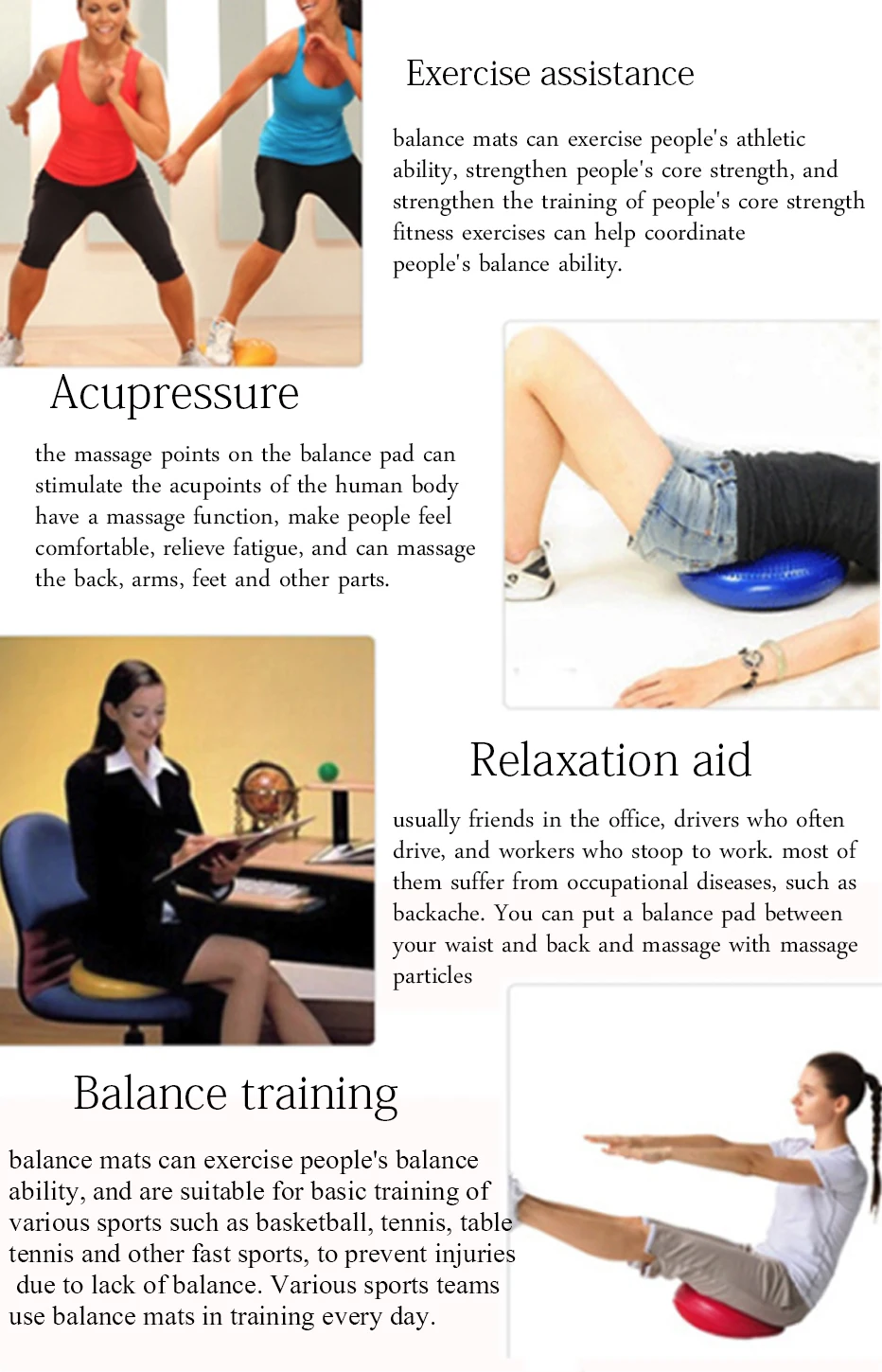 Материал: ПВХ Цвет: 10 цветов Подходит для: тренажеры, балансировочный коврик, коврик для йоги, массаж Посылка содержит: 1 надувной Массажный мяч для йоги Описание: 1. Надувной Массажный мяч для йоги может осуществлять баланс человека, усиливать силу сердцевины человека, усиливать силовые тренировки человеческого ядра и поддерживать баланс человека в йоге, аэробике и фитнес-упражнениях 2. Можно массировать надувным массажным мячом для йоги, чтобы стимулировать акупунктурные точки человеческого тела, эффективно массировать, чтобы снять усталость, и массировать спину, руки, ноги и другие части 3. Сильная выносливость и основная реабилитационная подготовка