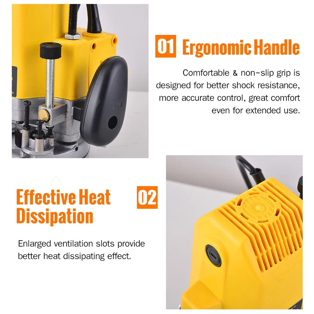 Этот стационарный базовый маршрутизатор оснащен удобной рукояткой, медным мотором, эффективным рассеиванием тепла и точной регулировкой глубины, обеспечивает Скорость без нагрузки до 10000 об/мин, обеспечивает комфорт, баланс и точный контроль.
