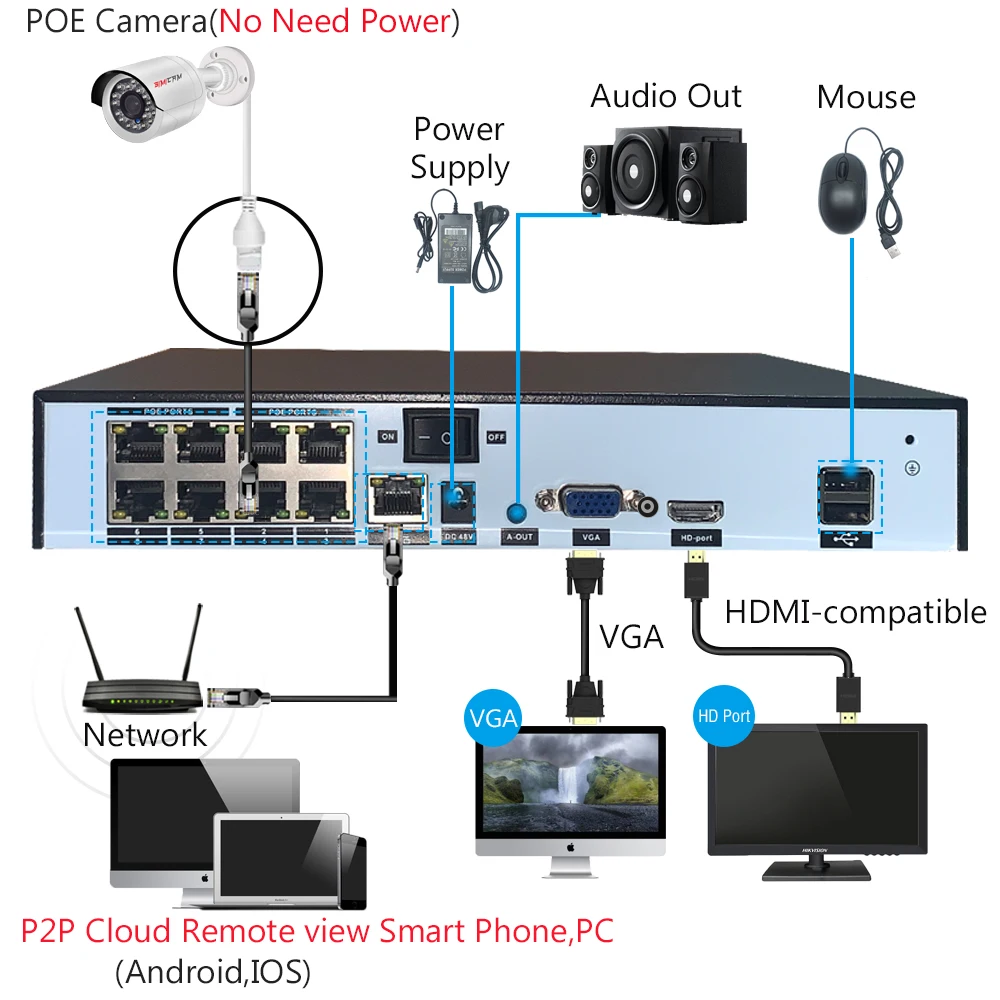 На задней панели NVR мы предоставляем HDMI и VGA full HD выходы. Получите телевизор или HD монитор и транслируйте видео в реальном времени к нему. Высокое качество видео гарантировано независимо от того, Играете ли вы или смотрите в реальном времени.