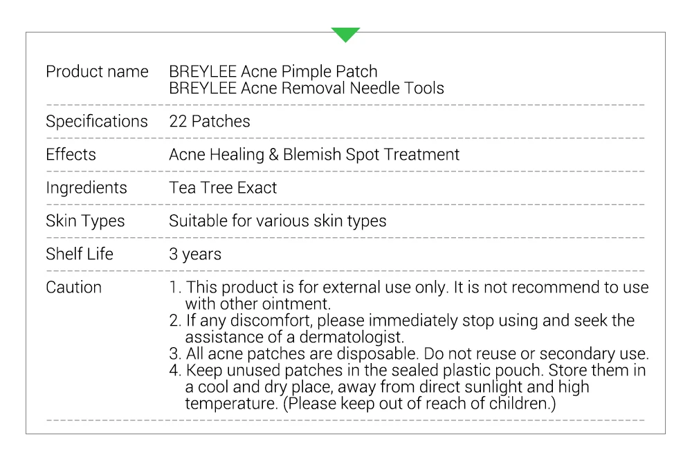 Название продукта: брейли акне прыщей патч BREYLEE игла для удаления прыщей инструменты Характеристики: 22 патча Эффекты: лечение акне и пятна Состав: точное чайное дерево Типы кожи: подходит для различных типов кожи Срок годности: 3 года Внимание: 1. Этот продукт предназначен только для внешнего использования. Не рекомендуется использовать С другой мазью. 2. Если есть какие-либо дискомфорта, пожалуйста, немедленно прекратите использование и ищите Помощь дерматолога. 3. Все акне являются одноразовыми. Не использовать повторно или вторично. 4. Храните неиспользованные патчи в герметичном пластиковом мешке. Храните их в В прохладном и сухом месте, вдали от прямых солнечных лучей и высоких Температура. (Пожалуйста, держите в недоступном для детей месте.)
