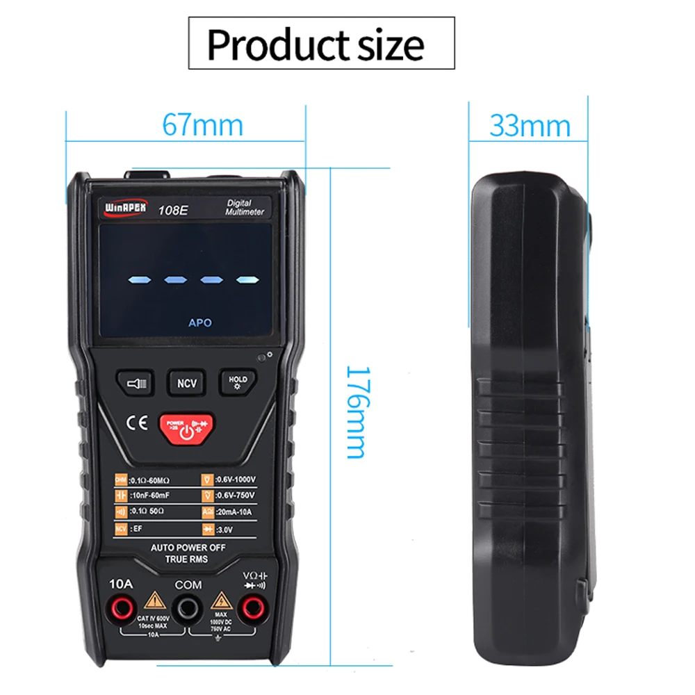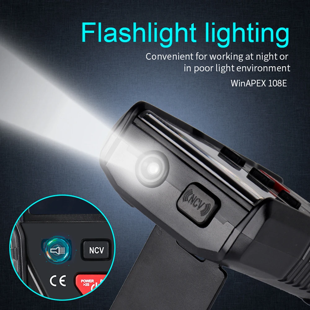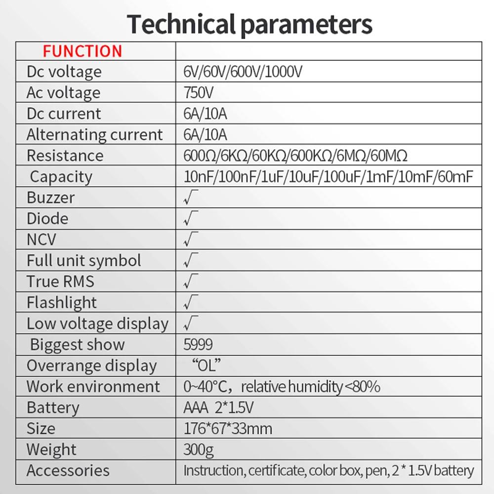 Функции: измерение напряжения переменного и постоянного тока, Измерение тока переменного и постоянного тока, измерение емкости, измерение сопротивления, фонарик, подсветка, TRMS, NCV, зуммер, диод, Автоматическое отключение питания, автоматический диапазон, хранение данных, 5999 отсчетов, ЖК-дисплей высокой четкости.
