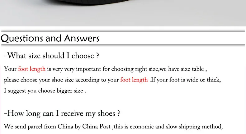1. Мы не американские размеры. Мы не европейские размеры. В Китае только длина стопы определяет правильные размеры. Не измеряйте длину подошвы. Не измеряйте длину стельки. Пожалуйста, измерьте длину вашей стопы, а затем выберите размер в соответствии с нашей таблицей размеров. 2. Если вы чувствуете неприятный запах, это нормально, потому что новая обувь может иметь запах клея. 3. Фотография может отличаться от реальной обуви, фотография может быть яркой, настоящая обувь может быть темной. 4. Мы упаковываем обувь в пенопластовую сумку, а не коробку, поэтому обувь может немного помяться после получения.