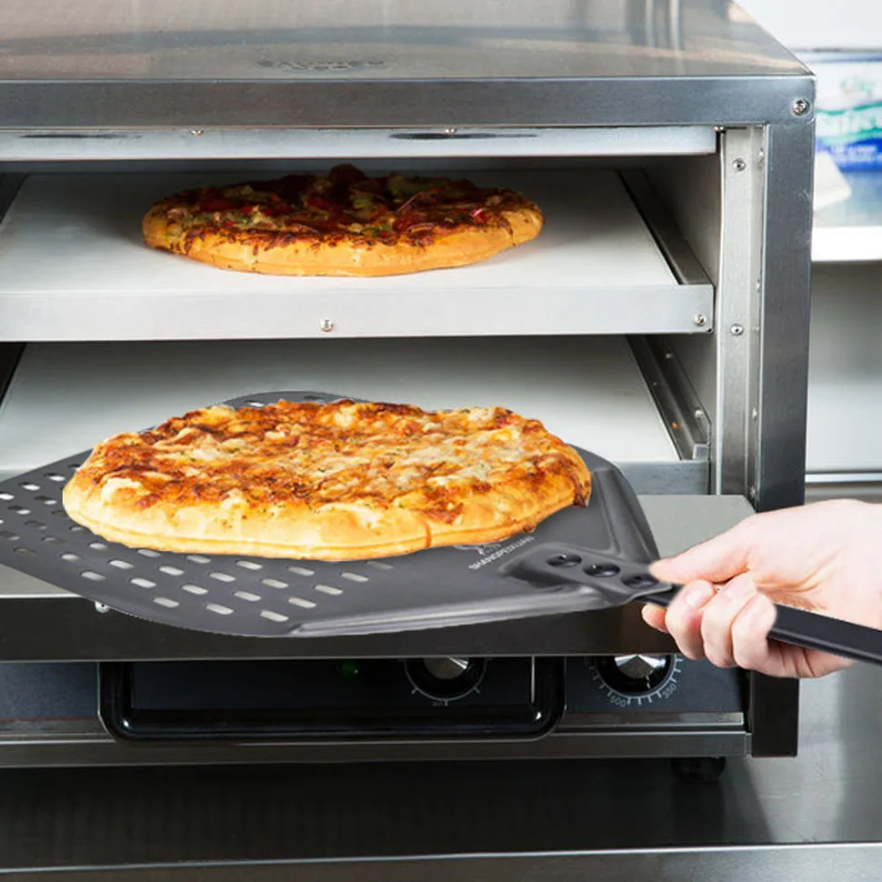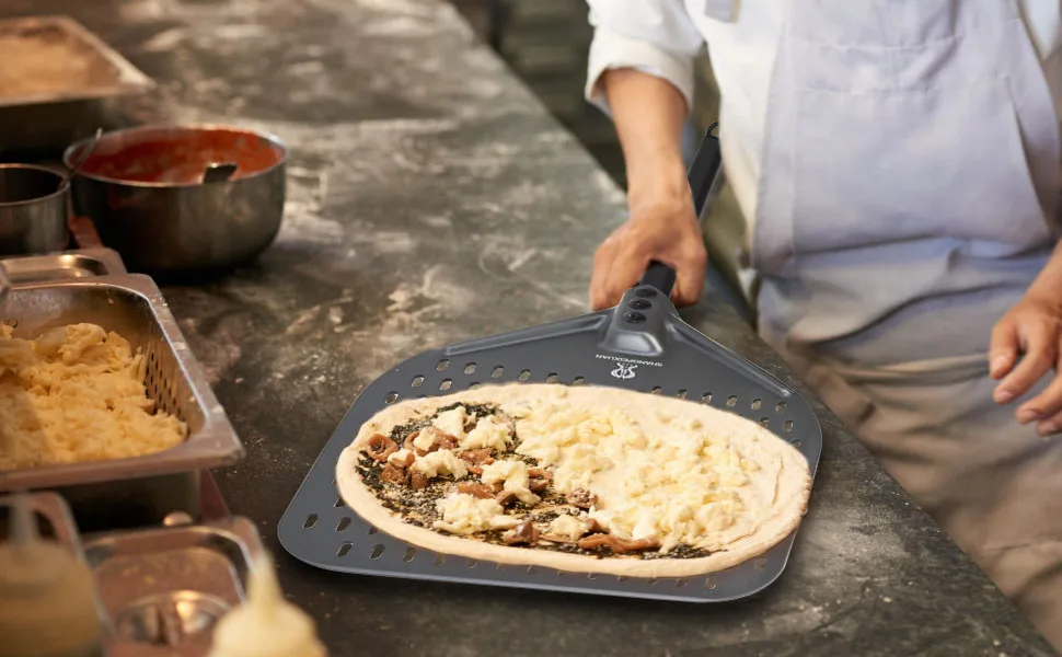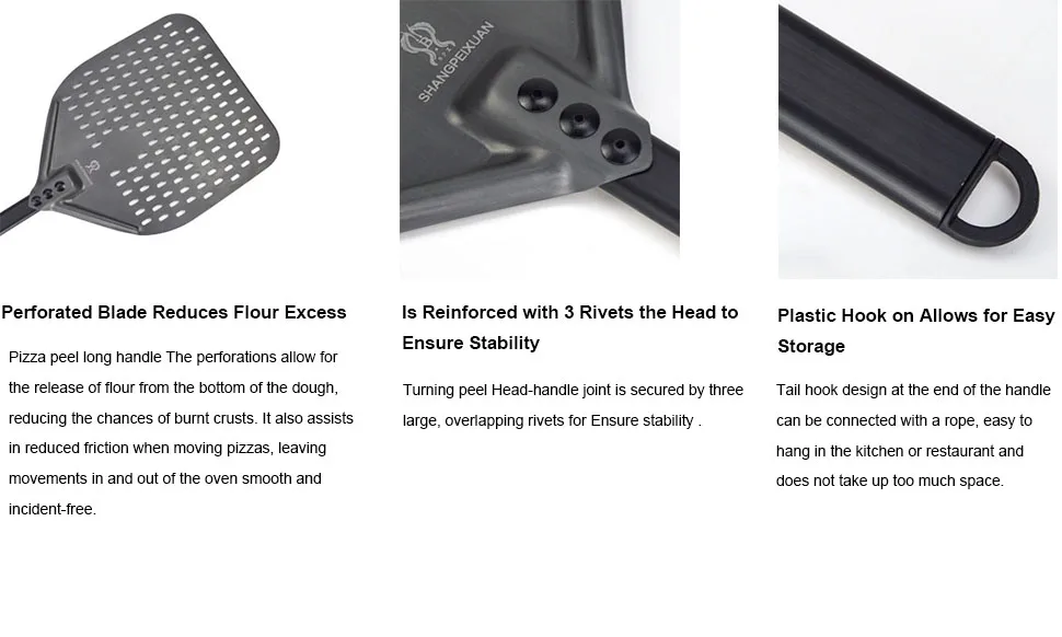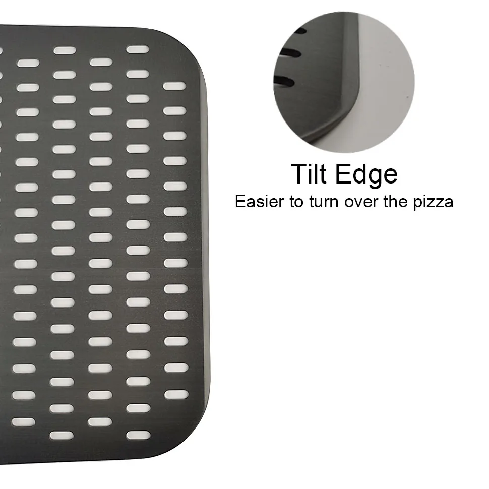 【Гибкая головка позволяет использовать скребок: Алюминиевые головки фрезерованные, скошенные края позволяют легче взять пиццу, чтобы пиццы лучше скользили, более легко в духовку. Перфорированная кожура для пиццы позволяет использовать меньше кукурузной муки или муки при переносе пиццы с рабочей станции в печь для пиццы, которая будет выпущена снизу, делает нижнюю часть пиццы более хрустящей.