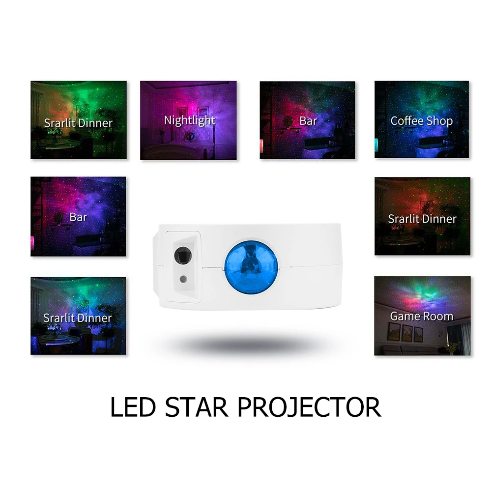 Этот продукт состоит из лазерный светильник, светильник режима и морской волны светильник. Он может быть спроектирован для мигания звезд, неподвижной Луны, плавающих облаков и других сцен. Не облучайте глаза лазером, пожалуйста, вдали от детей.